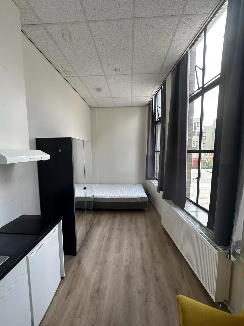 This studio on Kanaalstraat in Leeuwarden includes a private bathroom with a shower, toilet, and sink. The kitchen is equipped with a stove, sink, and refrigerator. Please note that pots, pans, and cutlery are not provided.