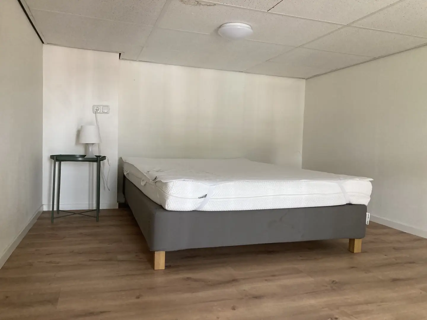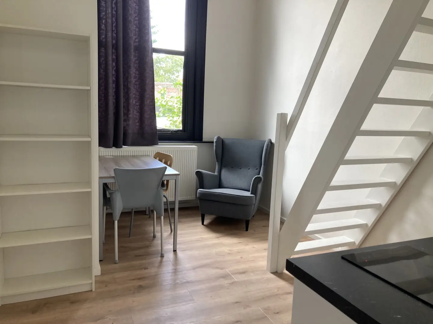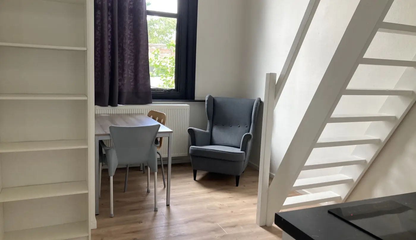 This studio on Kanaalstraat in Leeuwarden features an extra-high ceiling with a staircase leading to a mezzanine level. The mezzanine adds ample space and serves as a cozy sleeping area.