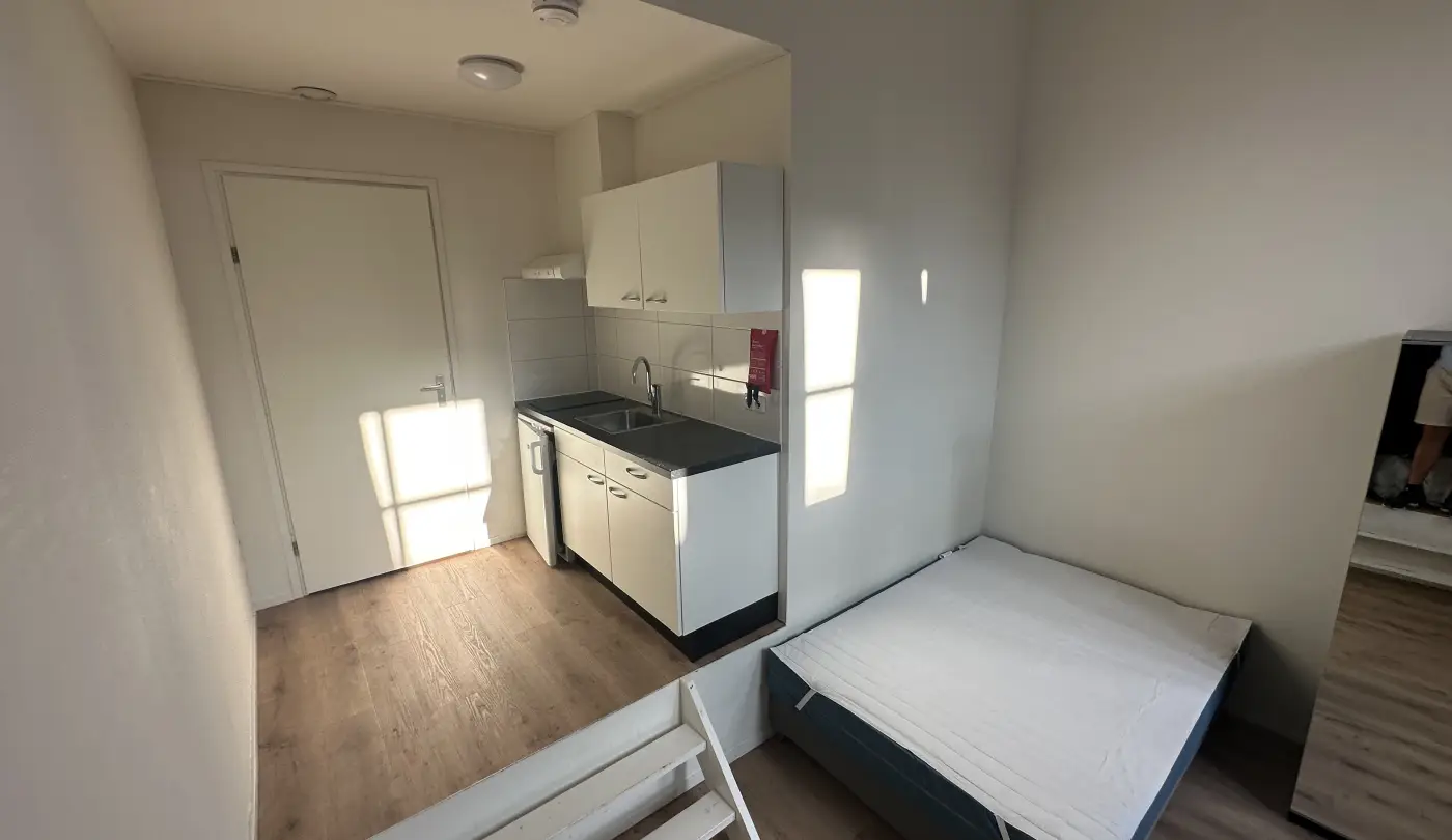 The studio is fully furnished as shown in the photos. It features a bed measuring 140 cm x 200 cm, a desk, a chair, and a wardrobe for your clothing.