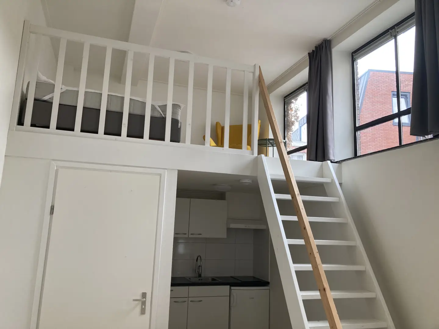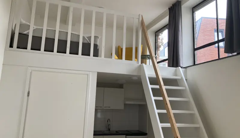 This studio on Kanaalstraat in Leeuwarden features an extra-high ceiling with a staircase leading to a mezzanine level. The mezzanine adds ample space and serves as a cozy sleeping area.