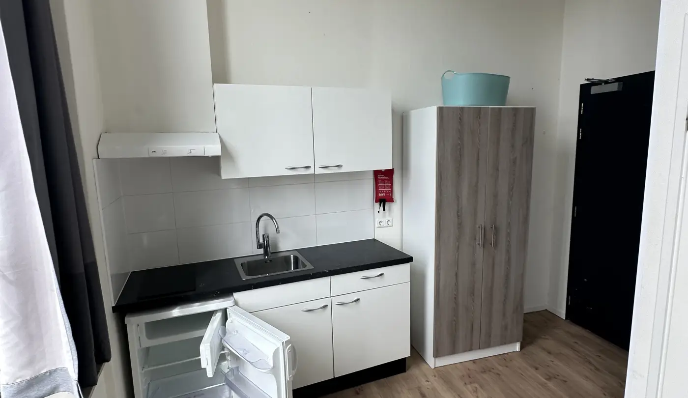 This studio on Kanaalstraat in Leeuwarden includes a private bathroom with a shower, toilet, and sink. The kitchen is equipped with a stove, sink, and refrigerator. Please note that pots, pans, and cutlery are not provided.