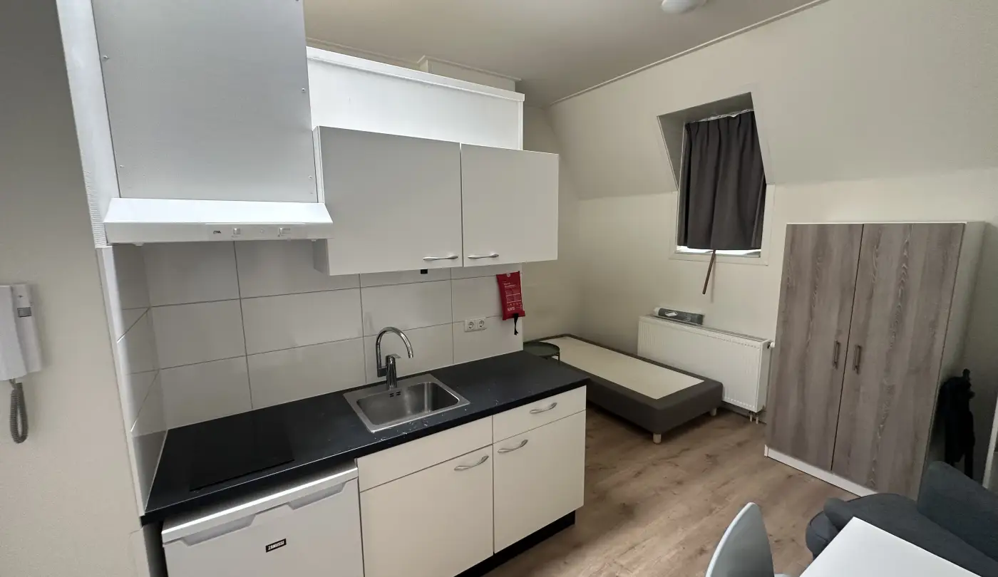 This studio on Kanaalstraat in Leeuwarden includes a private bathroom with a shower, toilet, and sink. The kitchen is equipped with a stove, sink, and refrigerator. Please note that pots, pans, and cutlery are not provided.