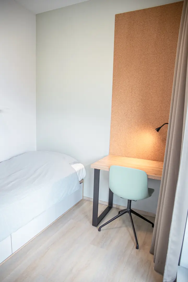 This private student room is situated in a beautifully designed shared apartment, offering a comfortable and practical living space. The bed measures 90cm by 200 cm and has storage space underneath. The room has a desk for your homework and a wardrobe.