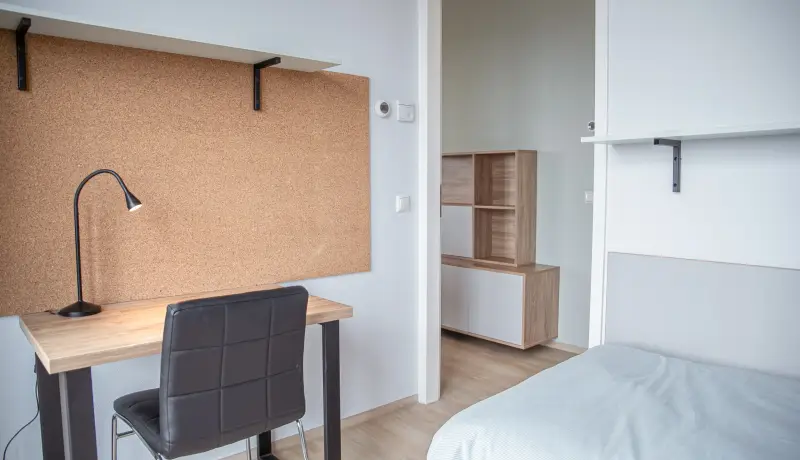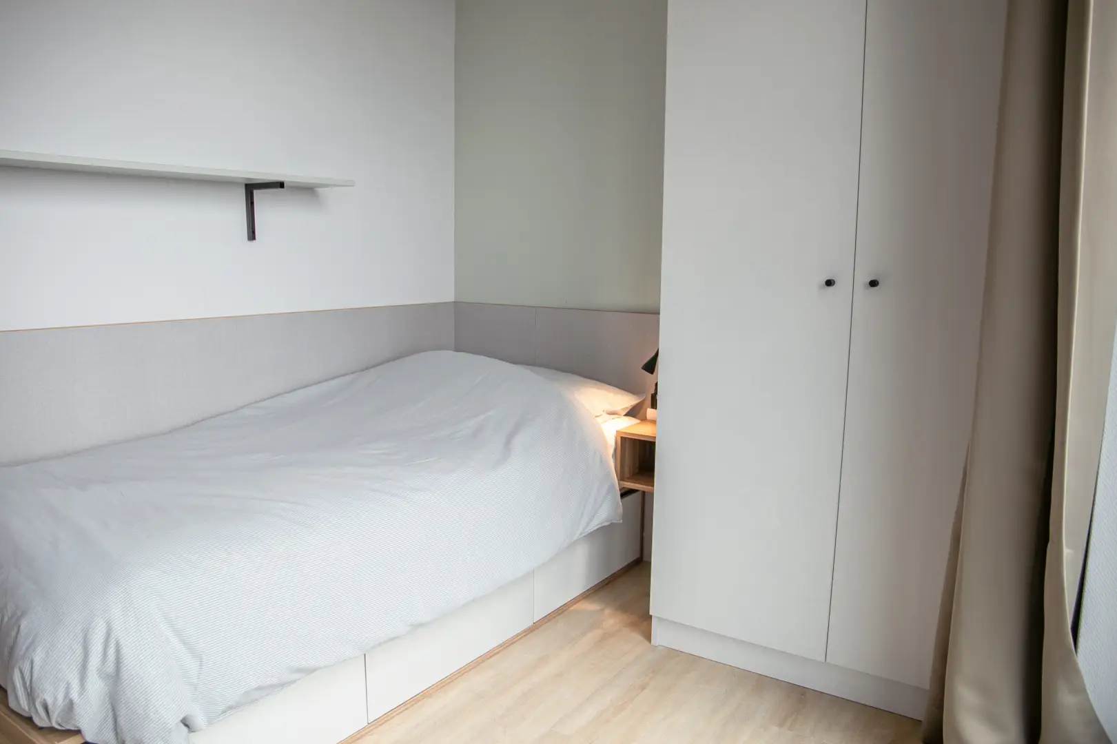 This private student room is situated in a beautifully designed shared apartment, offering a comfortable and practical living space. The bed measures 90cm by 200 cm and has storage space underneath. The room has a desk for your homework and a wardrobe.