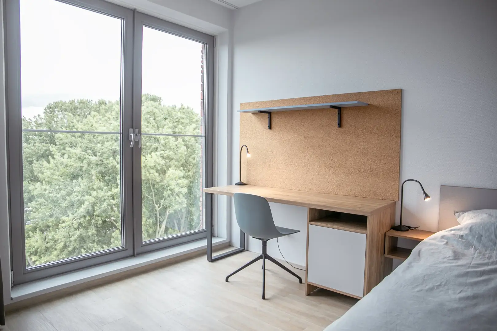 This private student room is situated in a beautifully designed shared apartment, offering a comfortable and practical living space. The bed measures 90cm by 200 cm and has storage space underneath. The room has a desk for your homework and a wardrobe.