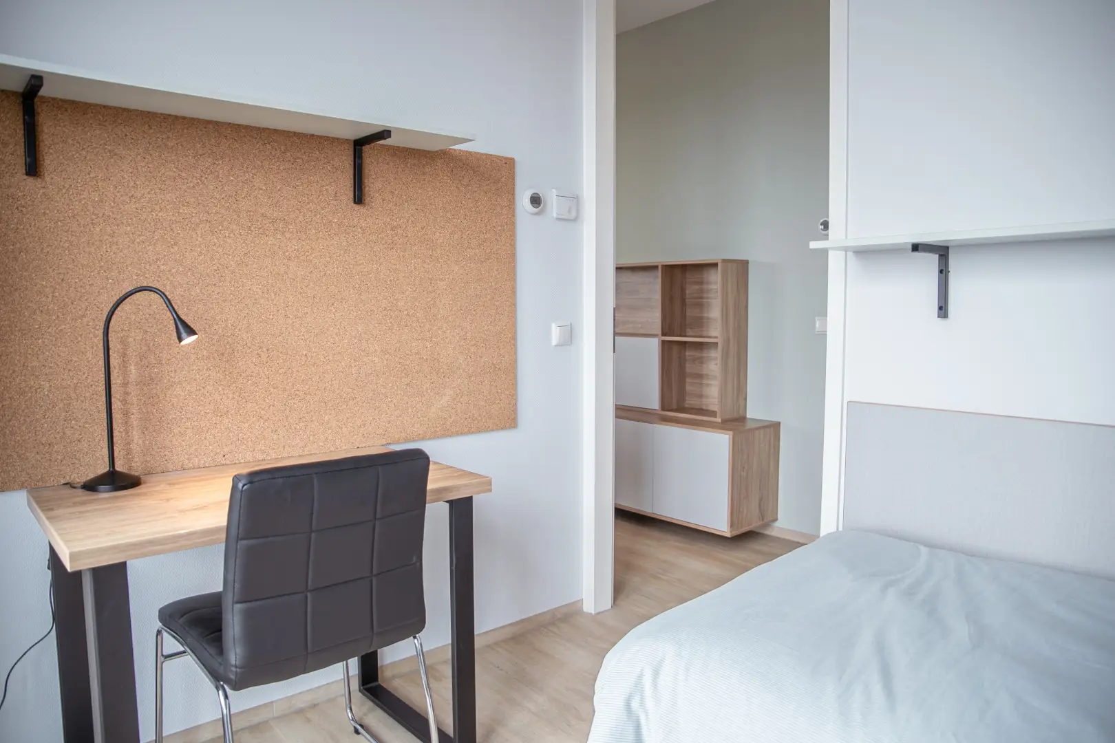 This private student room is situated in a beautifully designed shared apartment, offering a comfortable and practical living space. The bed measures 90cm by 200 cm and has storage space underneath. The room has a desk for your homework and a wardrobe.