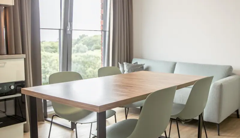 The living area includes a large dining table, a cozy sofa, creating a warm and inviting atmosphere for you and your roommate to enjoy.
