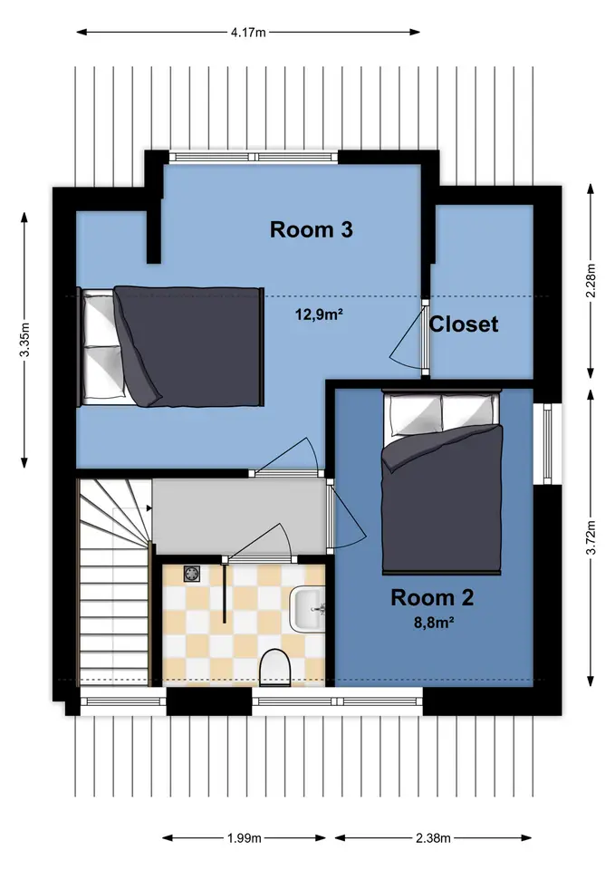 The Lekkumerweg 67 house is a newly build house in a quiet street. The house is 90 m2 big. With 2 full bedrooms, where one has a spacious walk-in closet, the house features a big living - kitchen area with a light and spacious outside patio. Next to the big garden there is a garden shed for bikes or other materials. The accommodation is equipped with furniture such as a beds, wardrobes and desks.