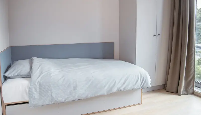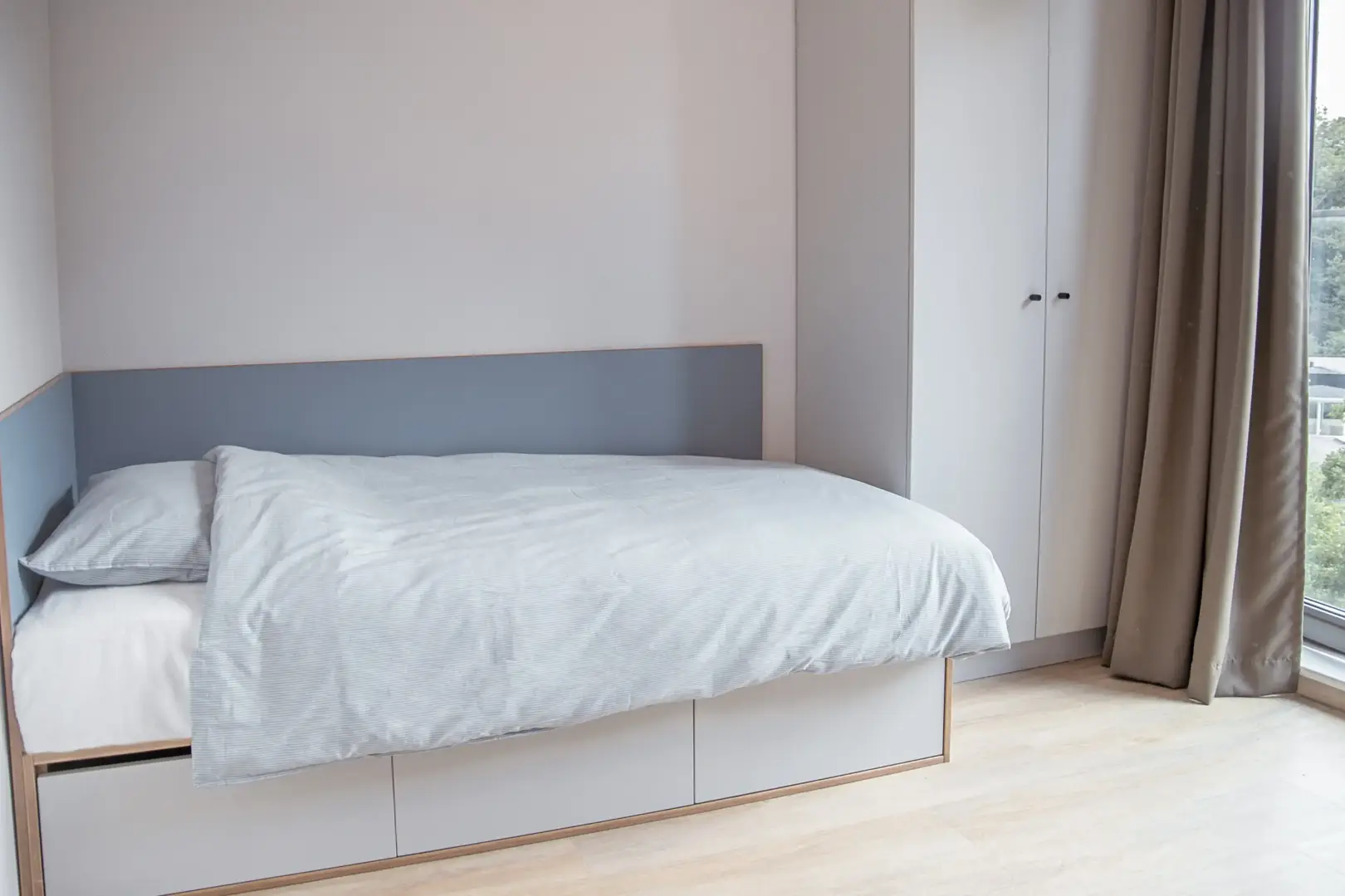 This private student room is situated in a beautifully designed shared denim blue apartment, offering a comfortable and practical living space. The bed measures 90cm by 200 cm and has storage space underneath. The room has a desk for your homework and a wardrobe.