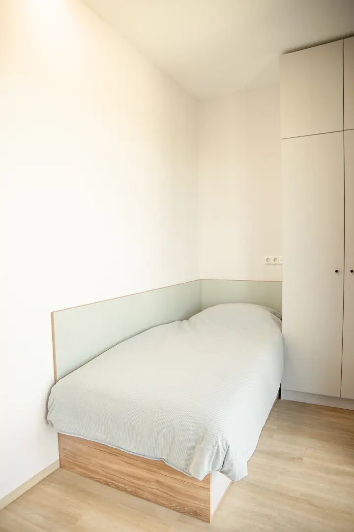 This private student room is situated in a beautifully designed shared apartment, offering a comfortable and practical living space. The bed measures 90cm by 200 cm and has storage space underneath. The room has a desk for your homework and a wardrobe.