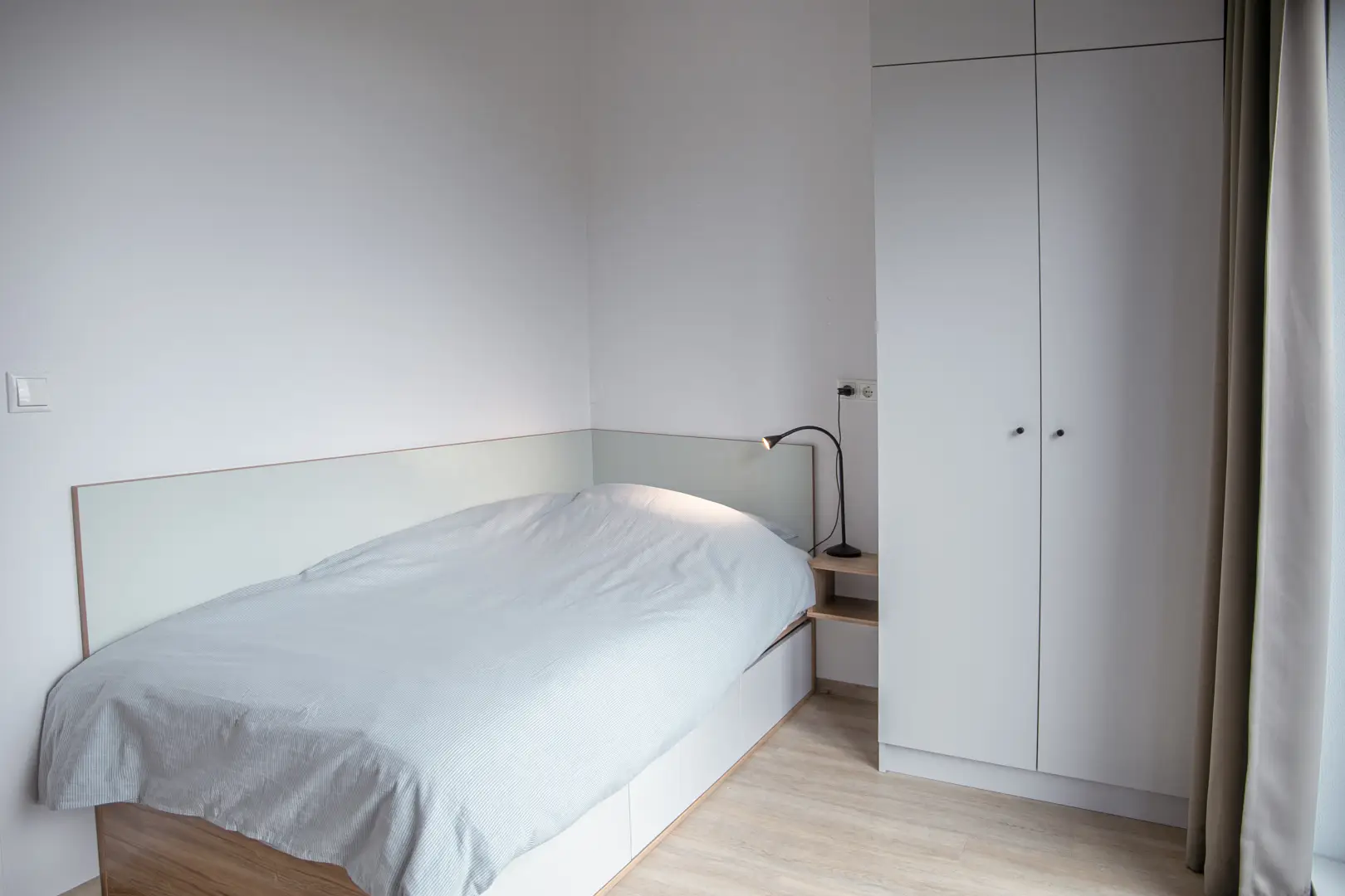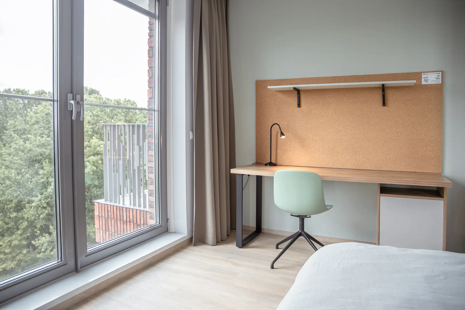 This private student room is situated in a beautifully designed shared apartment, offering a comfortable and practical living space. The bed measures 90cm by 200 cm and has storage space underneath. The room has a desk for your homework and a wardrobe.