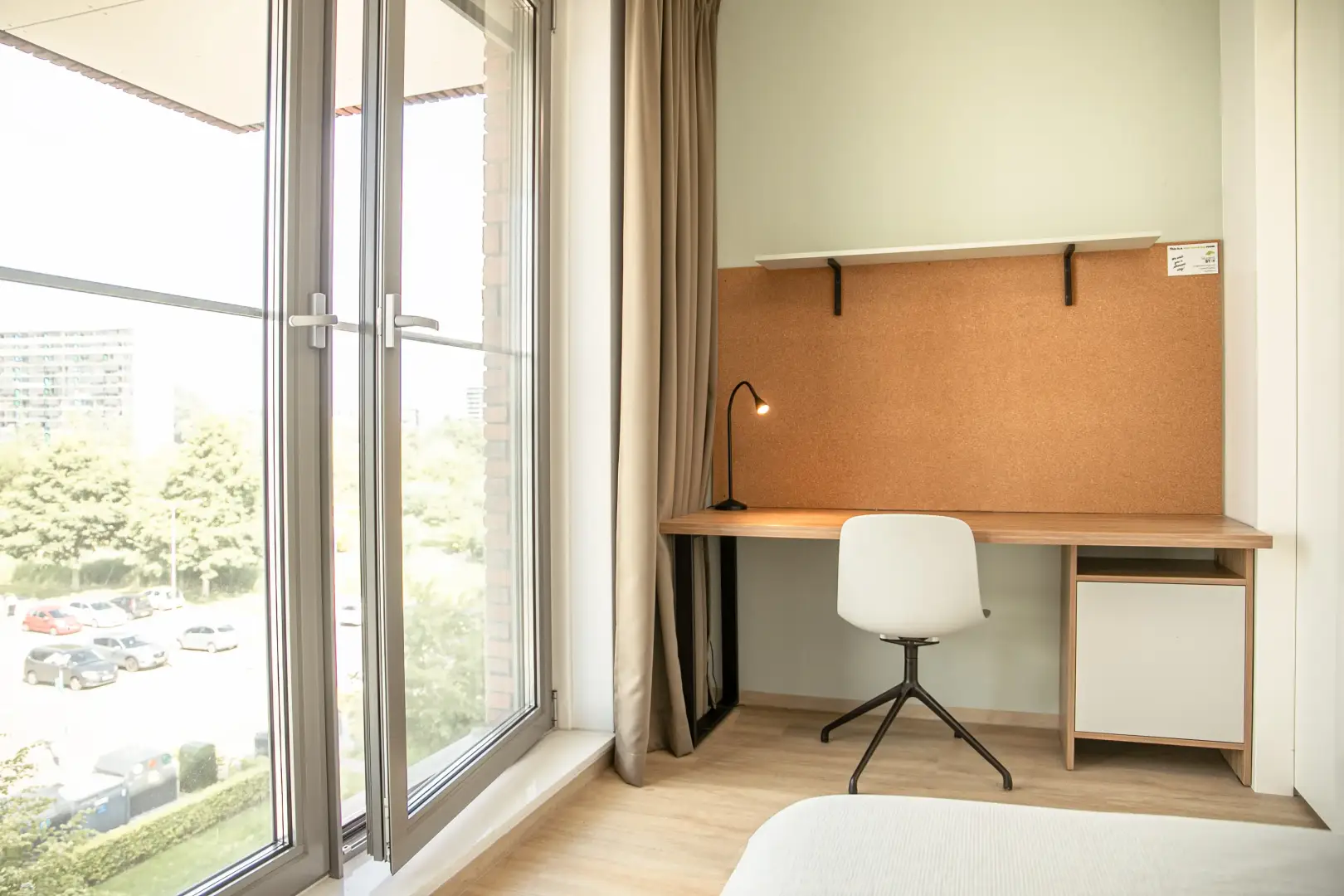This private student room is situated in a beautifully designed shared apartment, offering a comfortable and practical living space. The bed measures 90cm by 200 cm and has storage space underneath. The room has a desk for your homework and a wardrobe.