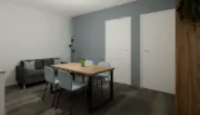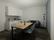 The apartment features a fully furnished, open-plan kitchen and living area, providing a spacious environment perfect for both relaxing and socializing.
