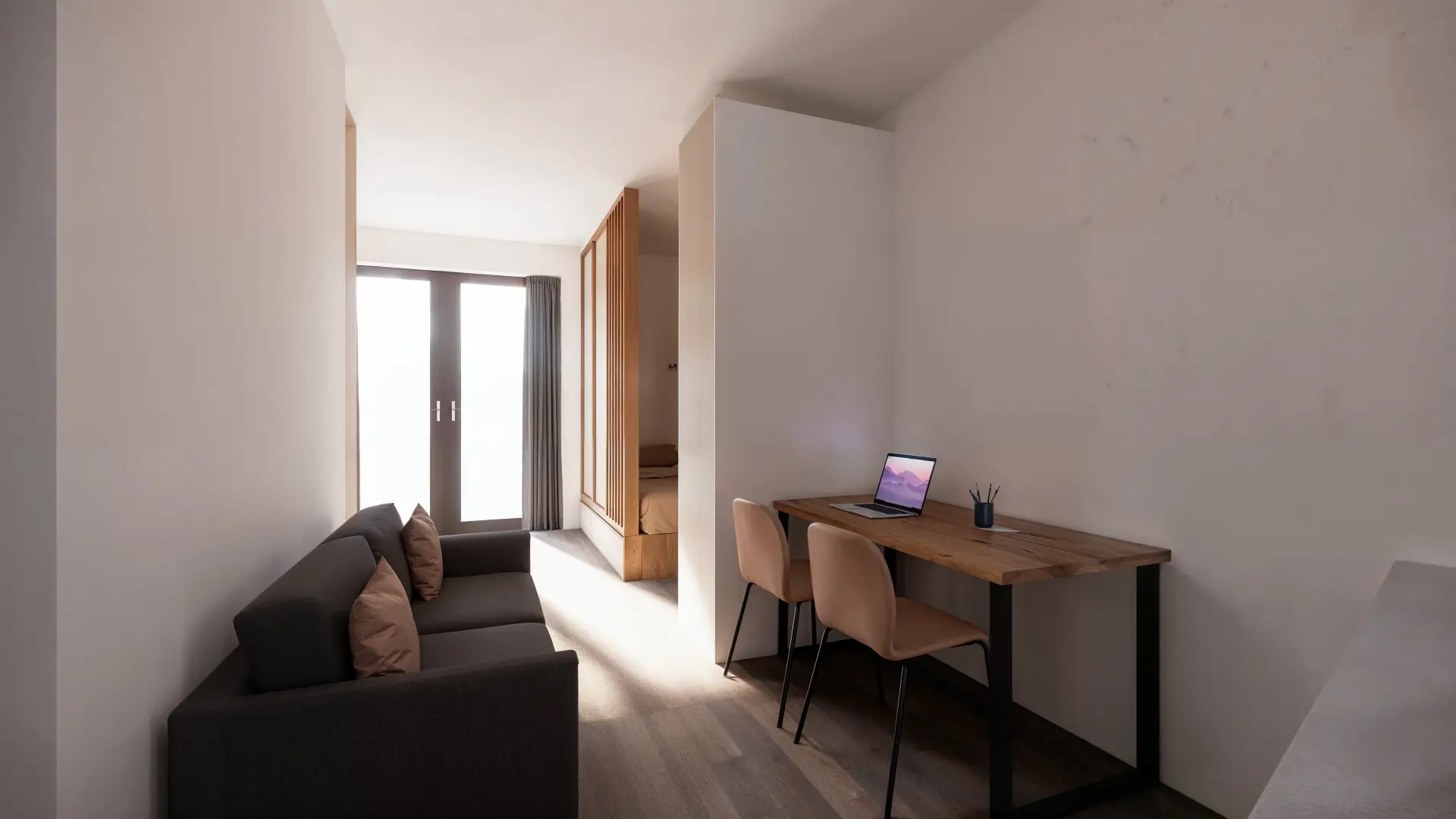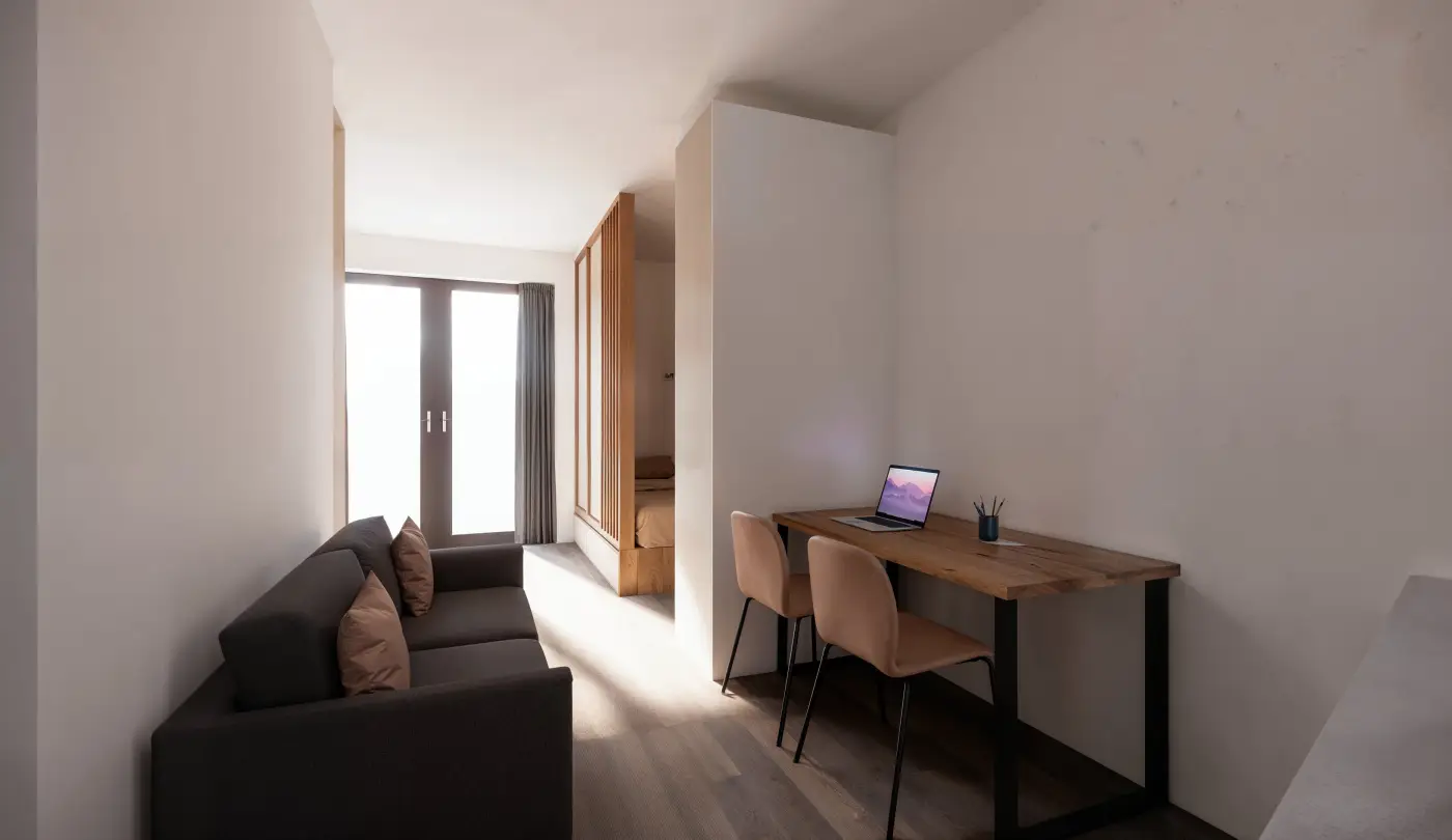 The furnishings in the residences are unique and designed to maximize storage space. A professional designer curated the interiors, incorporating a stylish color palette of antique rose, olive green, and denim blue to create a cozy and functional atmosphere.