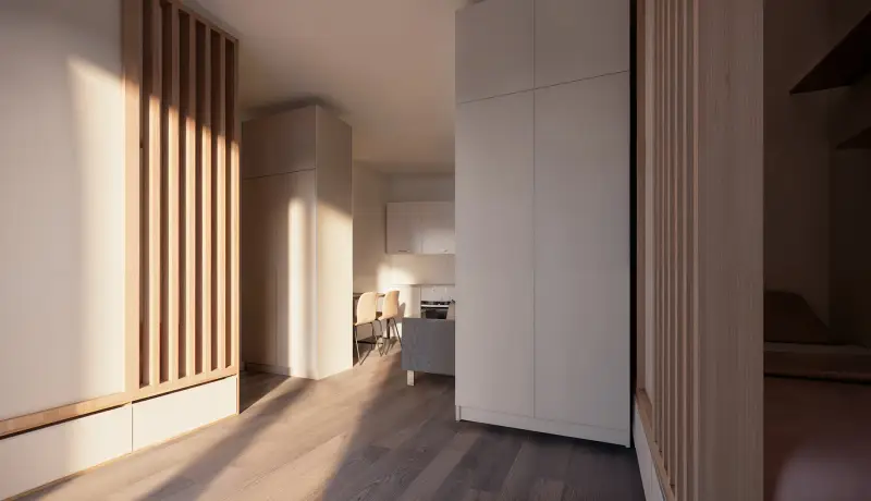 The furnishings in the residences are unique and designed to maximize storage space. A professional designer curated the interiors, incorporating a stylish color palette of antique rose, olive green, and denim blue to create a cozy and functional atmosphere.