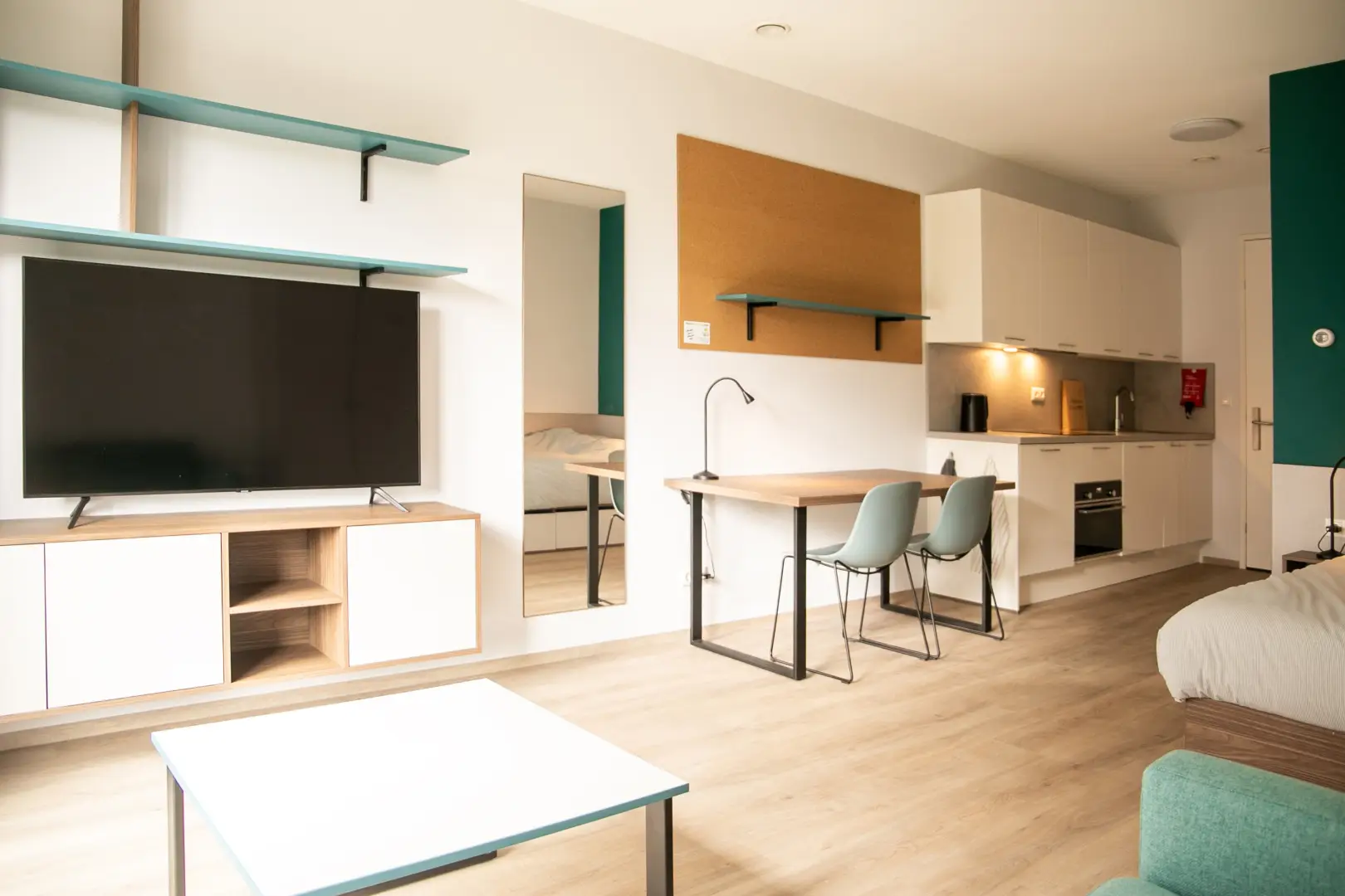 This beautiful Studio in building D is part of the campus of the NHL Stenden Hogeschool in Leeuwarden. You will find a fully furnished open kitchen, a living- and sleeping area. The Studio is equipped with a European double bed and measures 140cm wide and 200cm long. Underneath the bed you will find drawers for extra storage space. The living area of the Studio is equipped with a dining table, a large wardrobe, a 55-inch TV and a cozy couch with coffee table.