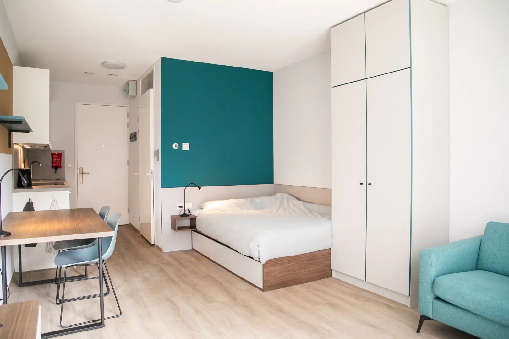 The furnishings in the residences are unique and designed to maximize storage space. A professional designer curated the interiors, incorporating a stylish color palette of light blue (turquise), ocean blue and dark green to create a cozy and functional atmosphere.