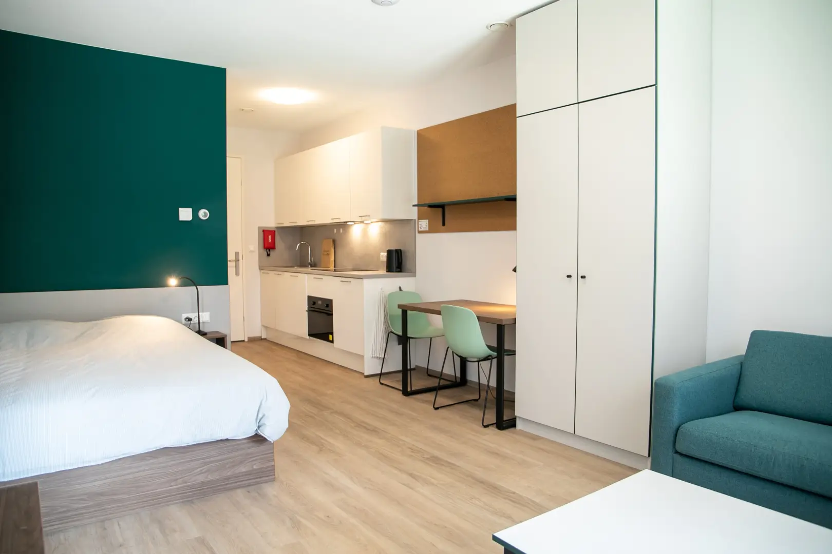 This beautiful Studio in building D is part of the campus of the NHL Stenden Hogeschool in Leeuwarden. You will find a fully furnished open kitchen, a living- and sleeping area. The Studio is equipped with a European double bed and measures 140cm wide and 200cm long. Underneath the bed you will find drawers for extra storage space. The living area of the Studio is equipped with a dining table, a large wardrobe, a 55-inch TV and a cozy couch with coffee table.