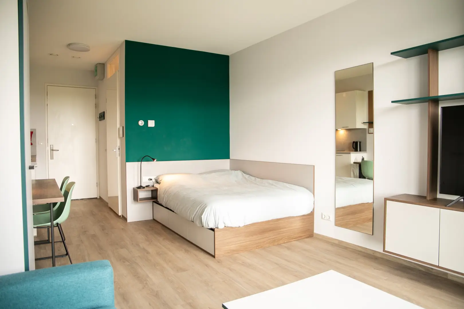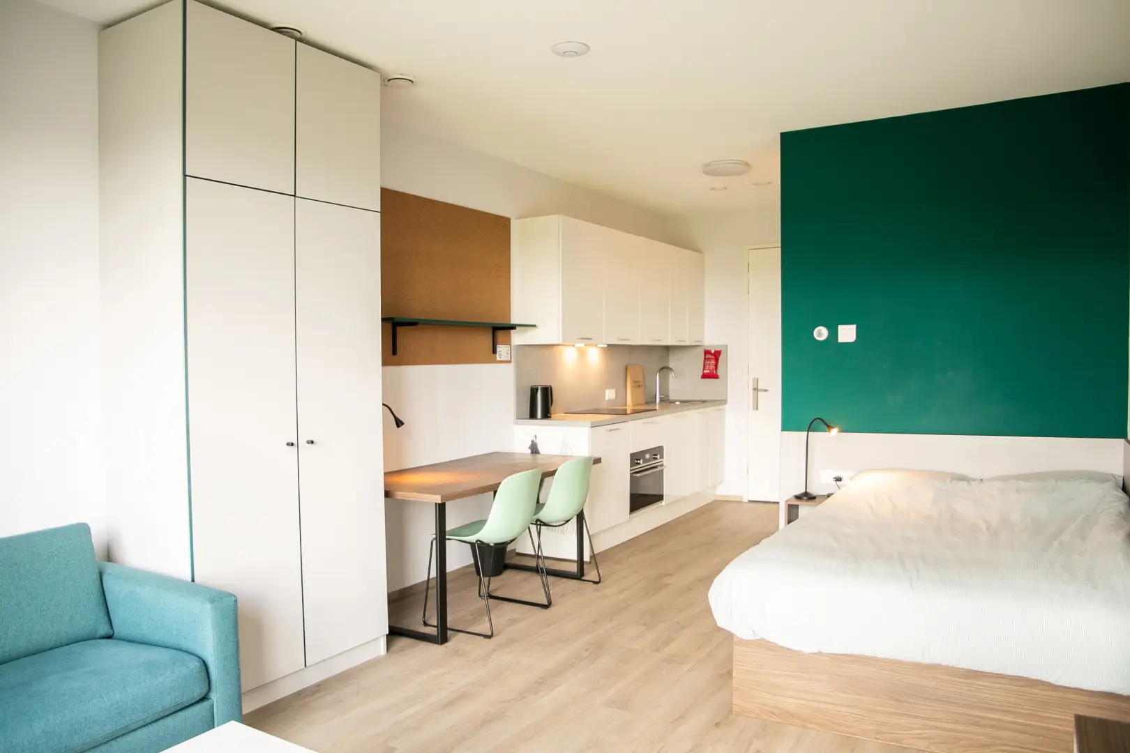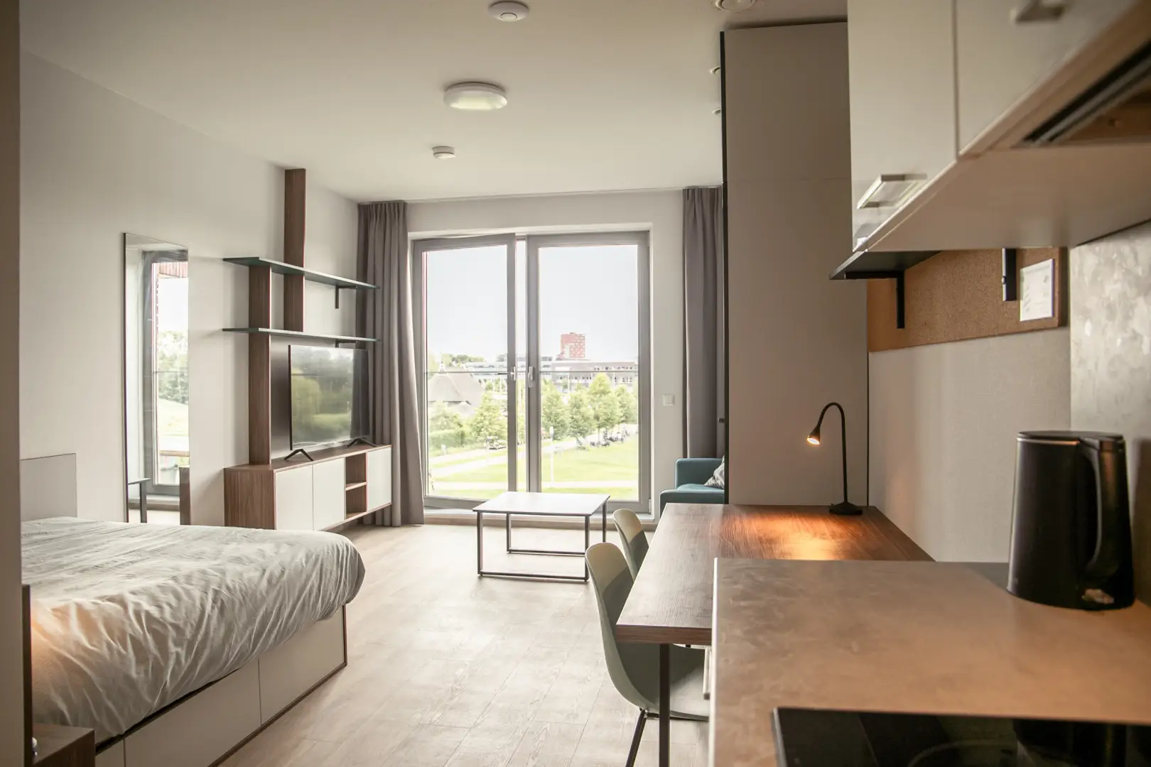 This beautiful Studio in building D is part of the campus of the NHL Stenden Hogeschool in Leeuwarden. You will find a fully furnished open kitchen, a living- and sleeping area. The Studio is equipped with a European double bed and measures 140cm wide and 200cm long. Underneath the bed you will find drawers for extra storage space. The living area of the Studio is equipped with a dining table, a large wardrobe, a 55-inch TV and a cozy couch with coffee table.
