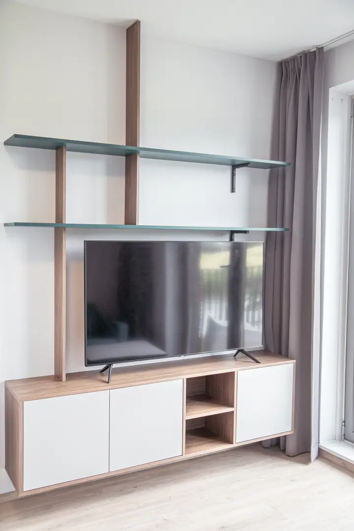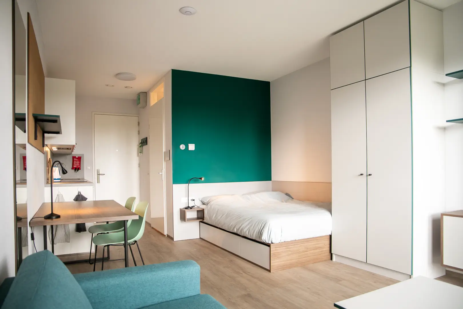 The furnishings in the residences are unique and designed to maximize storage space. A professional designer curated the interiors, incorporating a stylish color palette of light blue (turquise), ocean blue and dark green to create a cozy and functional atmosphere.