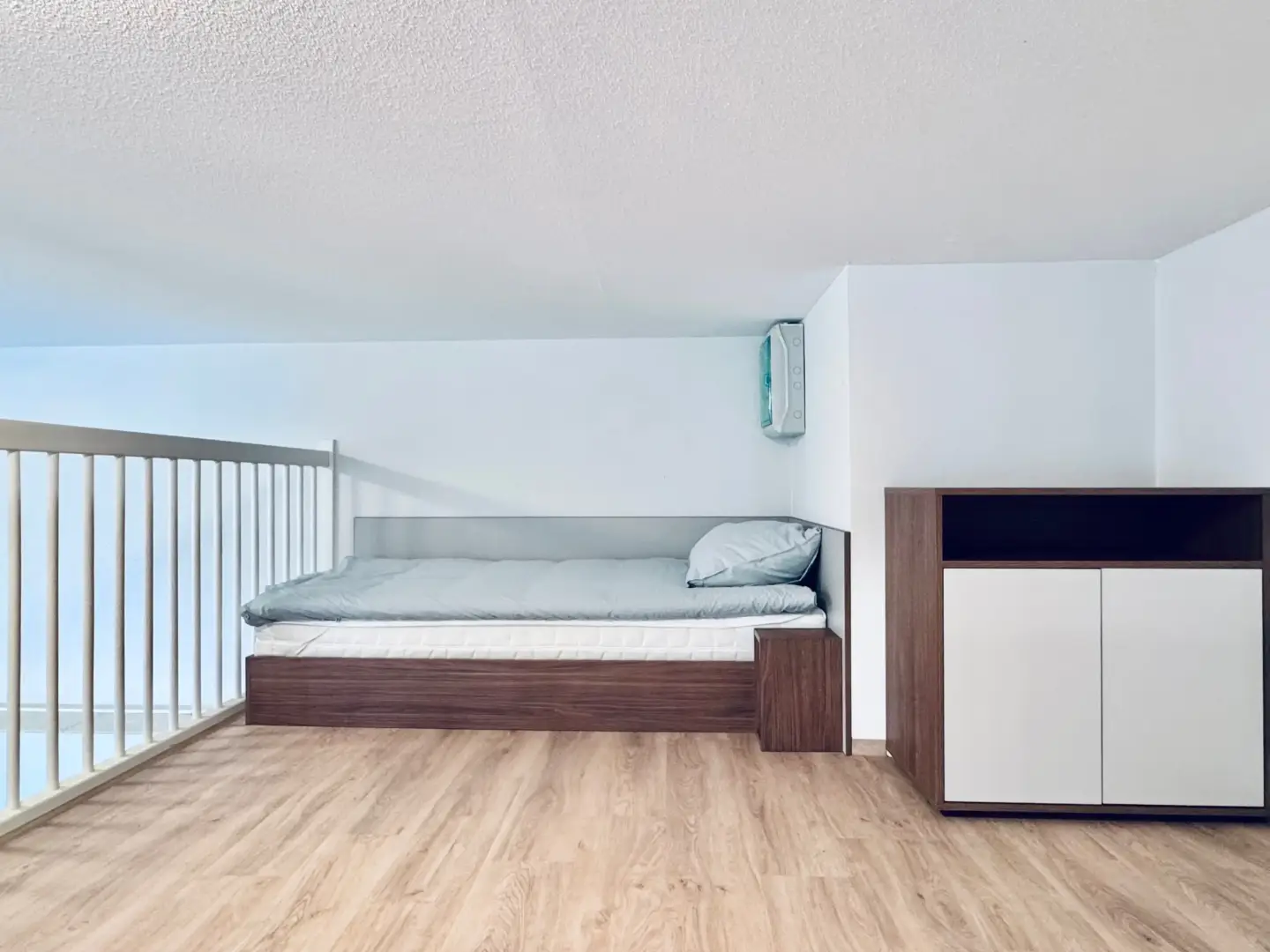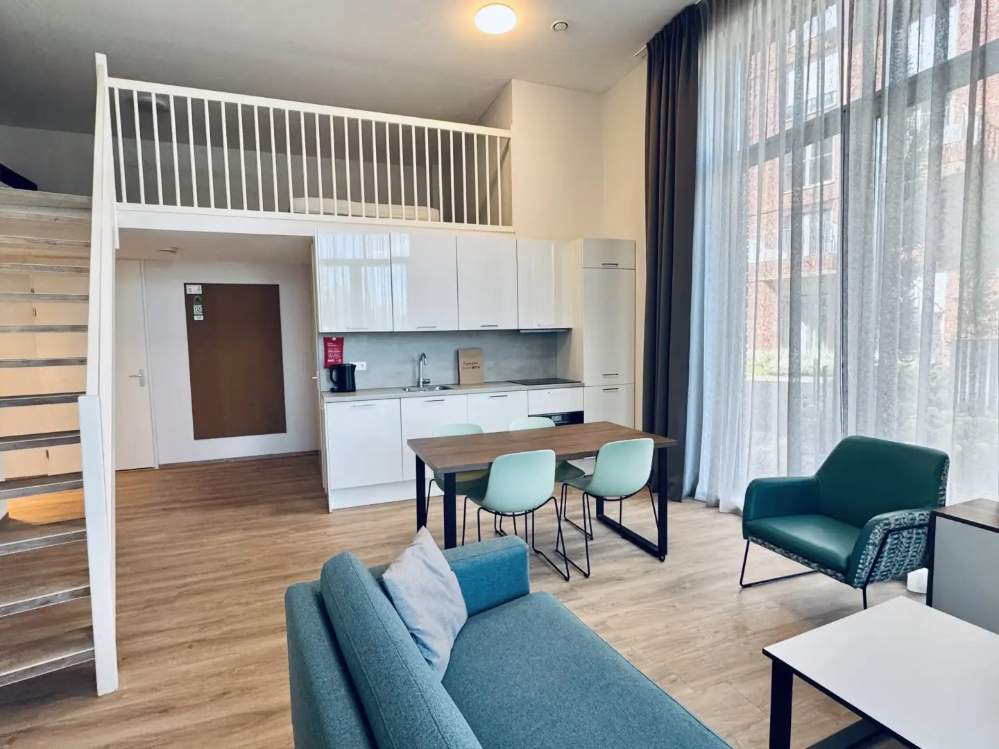 The Loft in building D is part of the campus of the NHL Stenden Hogeschool in Leeuwarden and located on the ground floor. The Superior Loft has an extra high ceiling and is in total 4 meters high. This apartment is equipped with a living room, a kitchen and a separate bedroom. A stair leads to a mezzanine floor with one extra bed. The bedroom on the ground floor is furnished with a European king size bed which measures 160cm wide and 200 long. On the second mezzanine floor you will find another European king size bed (160cm x 200cm) as well as a one person’s 90cm wide and 200cm long bed, which is perfect for sharing, or for sleepovers. The mezzanine floor is 150cm high. Please take a look at the floorplan of the ground floor mezzanine for sizes and the overview. In total this apartment gives room to three beds.