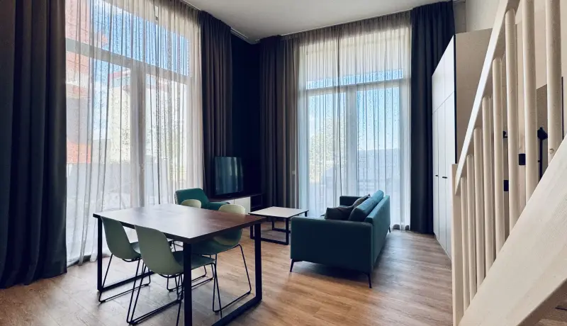 The living area of the Loft is equipped with a big dining table, a cozy couch with separate lounge chair and coffee table. There is a wardrobe to store your clothes.