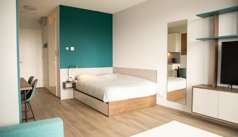 This beautiful Studio in building D is part of the campus of the NHL Stenden Hogeschool in Leeuwarden. You will find a fully furnished open kitchen, a living- and sleeping area. The Studio is equipped with a European double bed and measures 140cm wide and 200cm long. Underneath the bed you will find drawers for extra storage space. The living area of the Studio is equipped with a dining table, a large wardrobe, a 55-inch TV and a cozy couch with coffee table.