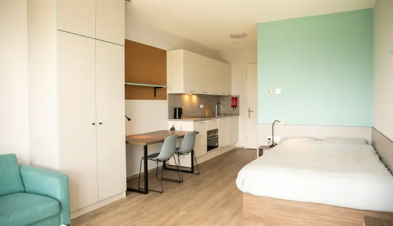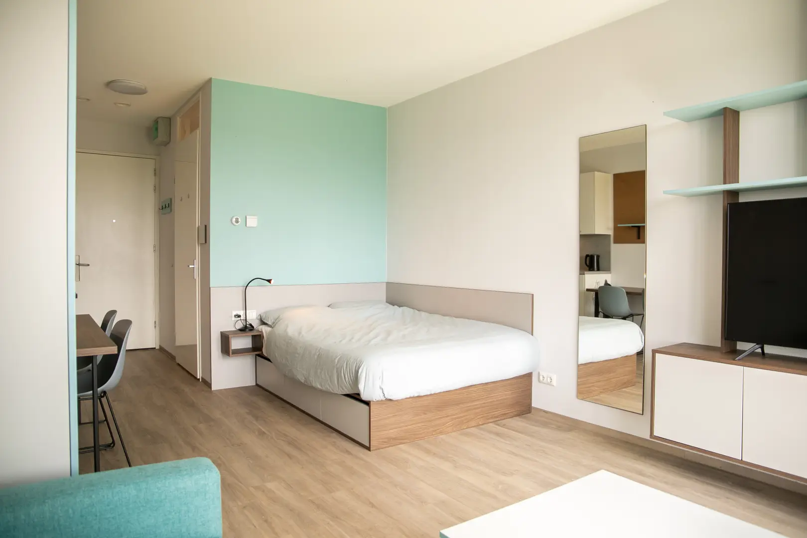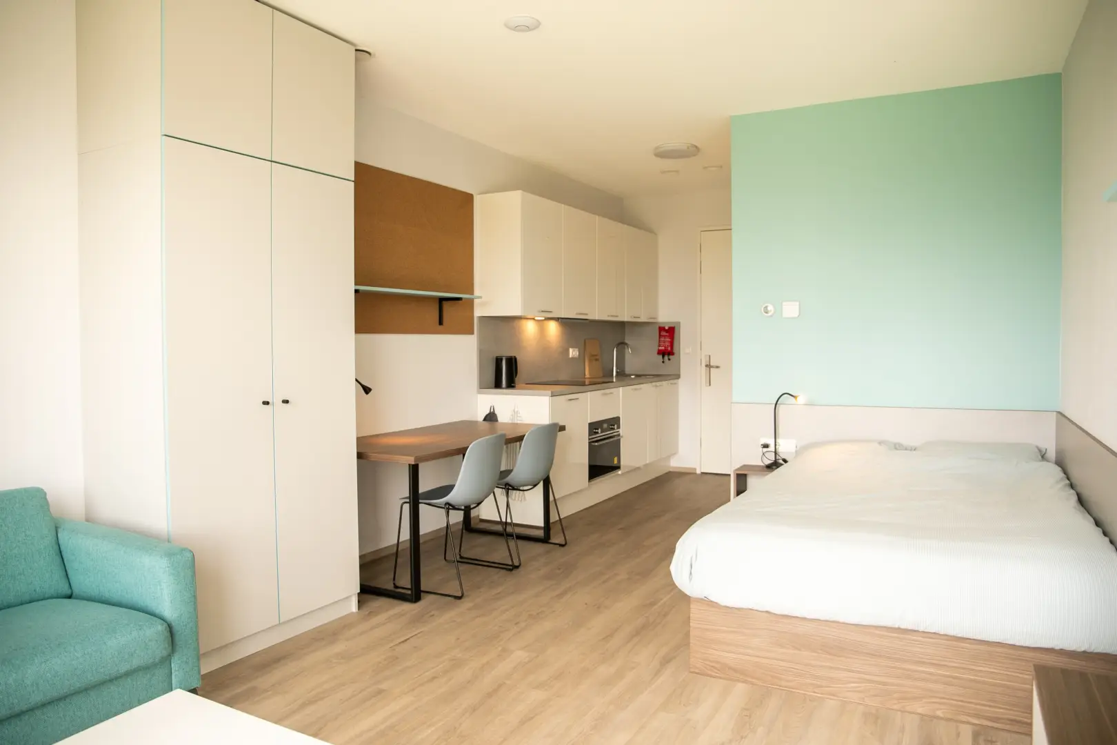 This beautiful Studio in building D is part of the campus of the NHL Stenden Hogeschool in Leeuwarden. You will find a fully furnished open kitchen, a living- and sleeping area. The Studio is equipped with a European double bed and measures 140cm wide and 200cm long. Underneath the bed you will find drawers for extra storage space. The living area of the Studio is equipped with a dining table, a large wardrobe, a 55-inch TV and a cozy couch with coffee table.