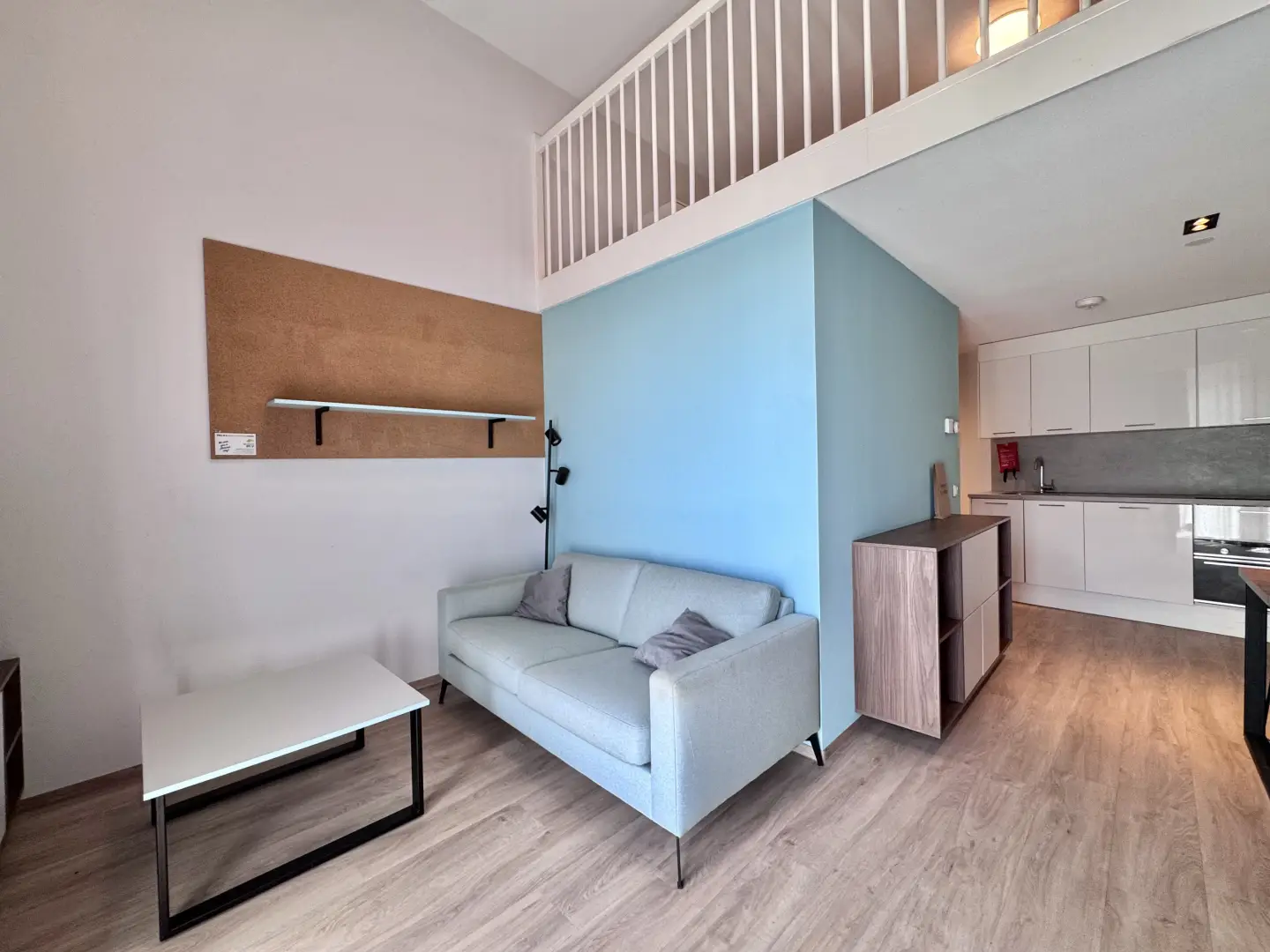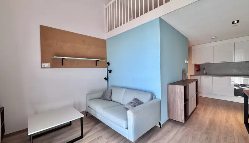 The Loft in building D is part of the campus of the NHL Stenden Hogeschool in Leeuwarden and located on the ground floor. The Loft has an extra high ceiling and is in total 4 meters high. This apartment is equipped with a living room and a kitchen on the ground floor. A stair leads to a second mezzanine floor. This floor is equipped with a European queen sized bed and measures 160cm wide and 200cm long. The mezzanine floor is 150 centimeter high and adds a lot of extra space to this room. Beneath the stairs is a build-in closet where you can store your clothes and suitcase.