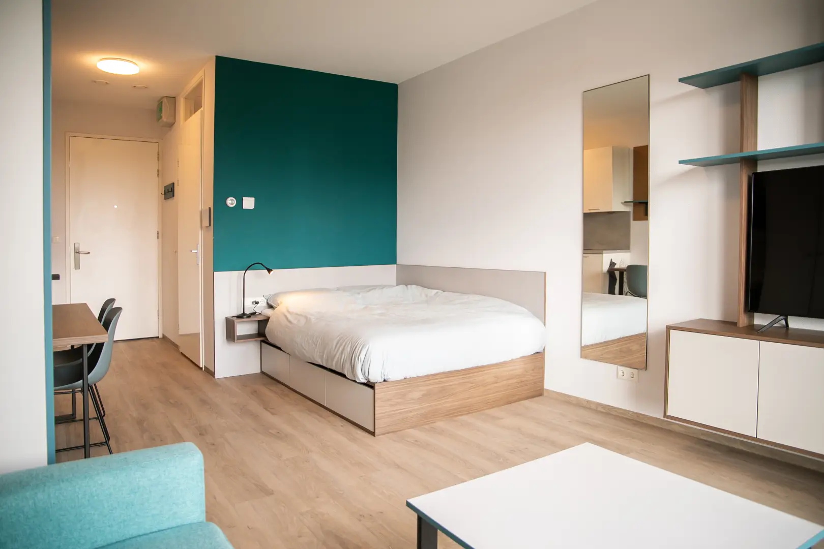 The furnishings in the residences are unique and designed to maximize storage space. A professional designer curated the interiors, incorporating a stylish color palette of light blue (turquise), ocean blue and dark green to create a cozy and functional atmosphere.