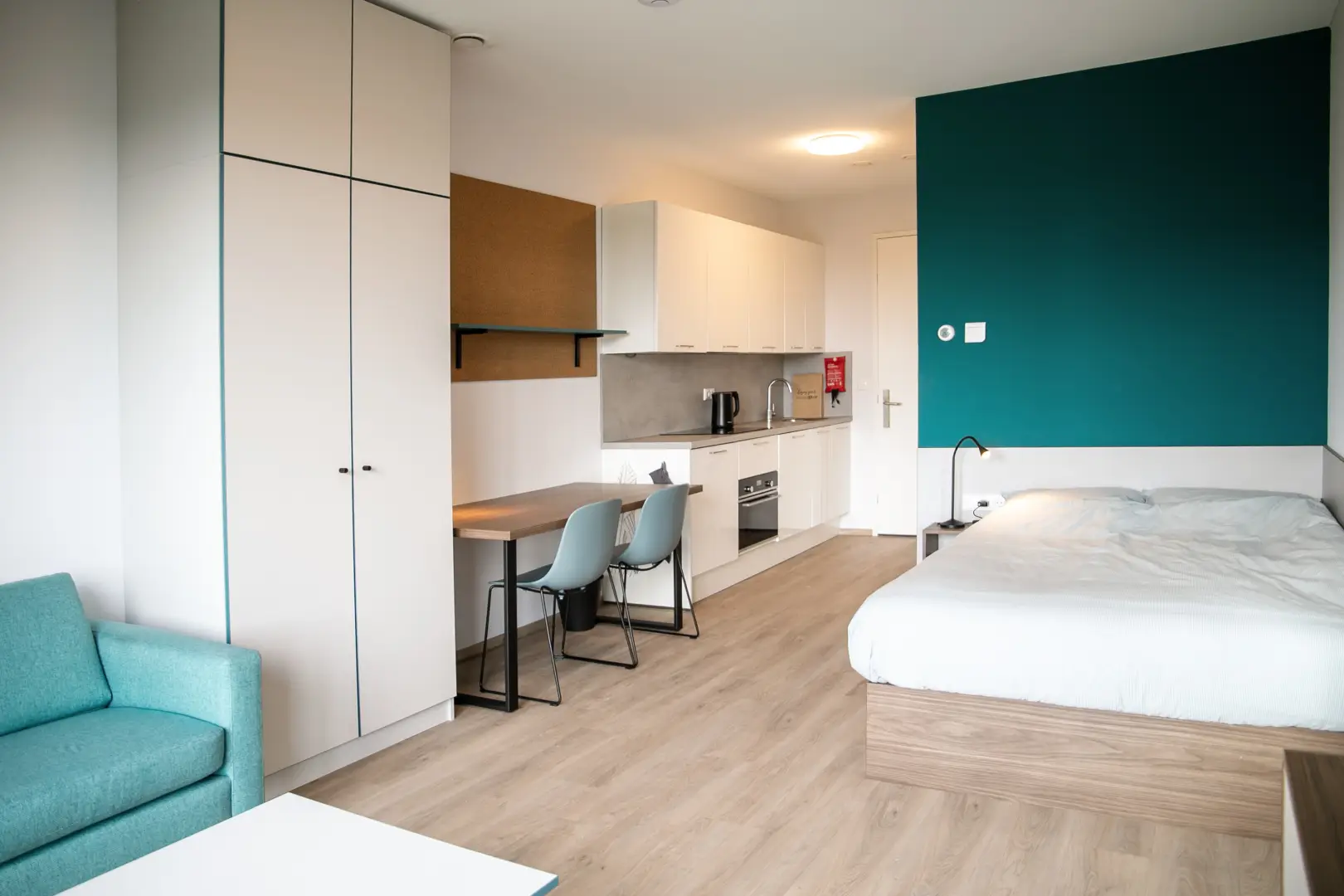 This beautiful Studio in building D is part of the campus of the NHL Stenden Hogeschool in Leeuwarden. You will find a fully furnished open kitchen, a living- and sleeping area. The Studio is equipped with a European double bed and measures 140cm wide and 200cm long. Underneath the bed you will find drawers for extra storage space. The living area of the Studio is equipped with a dining table, a large wardrobe, a 55-inch TV and a cozy couch with coffee table.