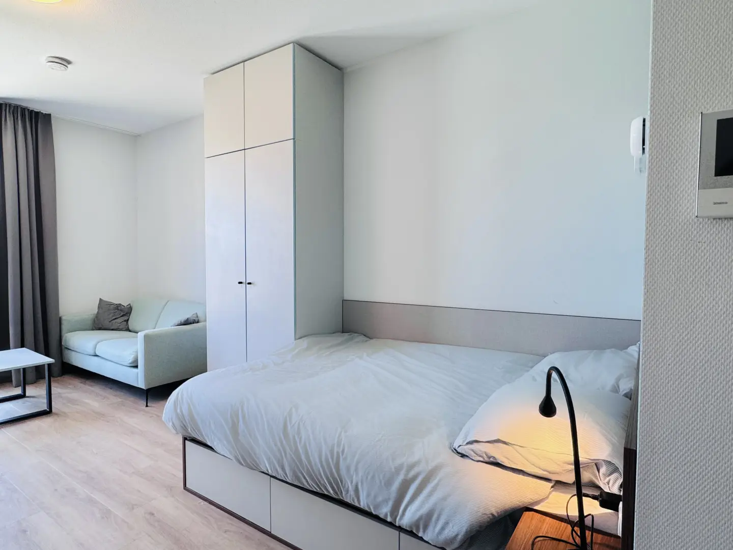 This beautiful Studio in building D is part of the campus of the NHL Stenden Hogeschool in Leeuwarden. You will find a fully furnished open kitchen, a living- and sleeping area. The Studio is equipped with a European double bed and measures 140cm wide and 200cm long. Underneath the bed you will find drawers for extra storage space. The living area of the Studio is equipped with a dining table, a large wardrobe, a 55-inch TV and a cozy couch with coffee table.