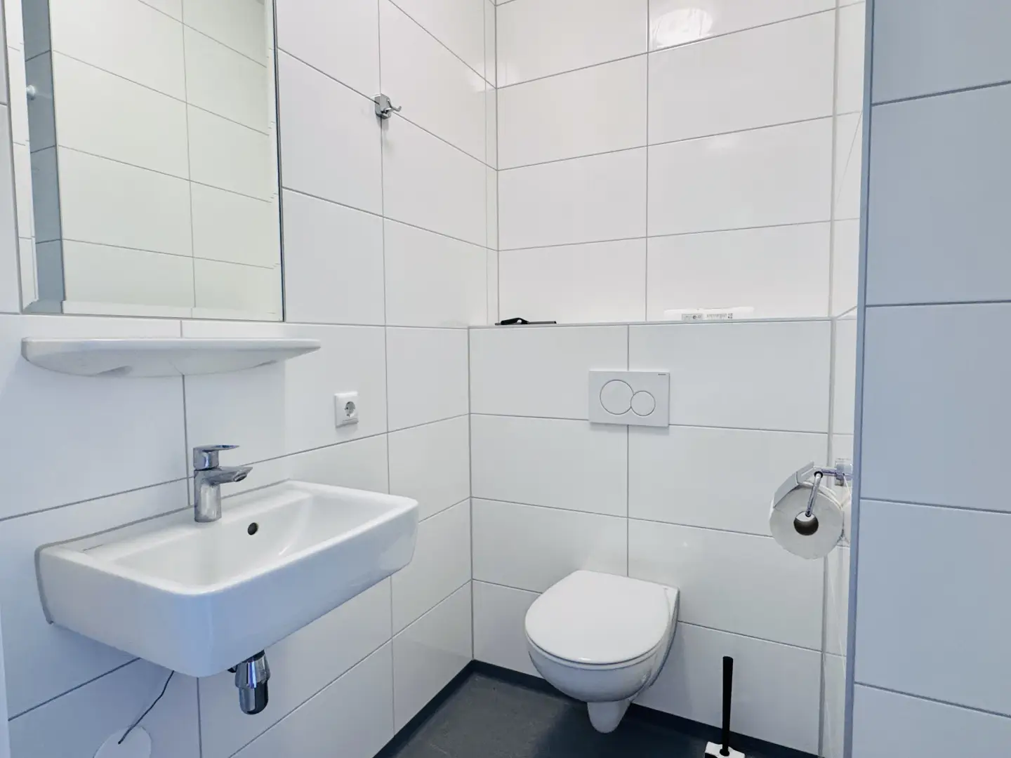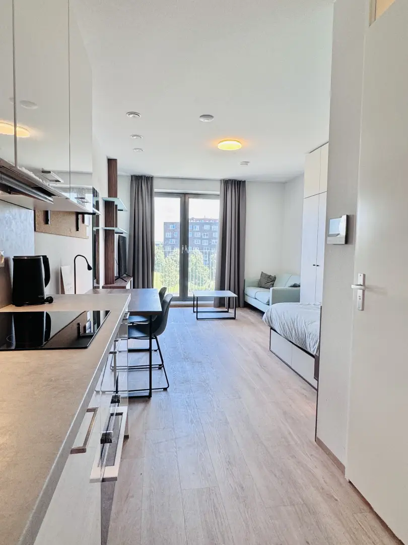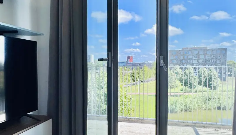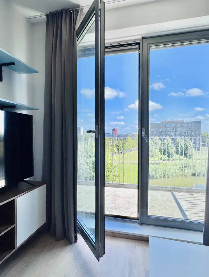 The kitchen is fully equipped with an oven/microwave-combination, stove, sink, refrigerator and a dishwasher. You won’t have to worry about cleaning dirty dishes yourself. Pots, pans and cutlery are not included. This specific Studio has nice, large, inward opening windows with a private balcony