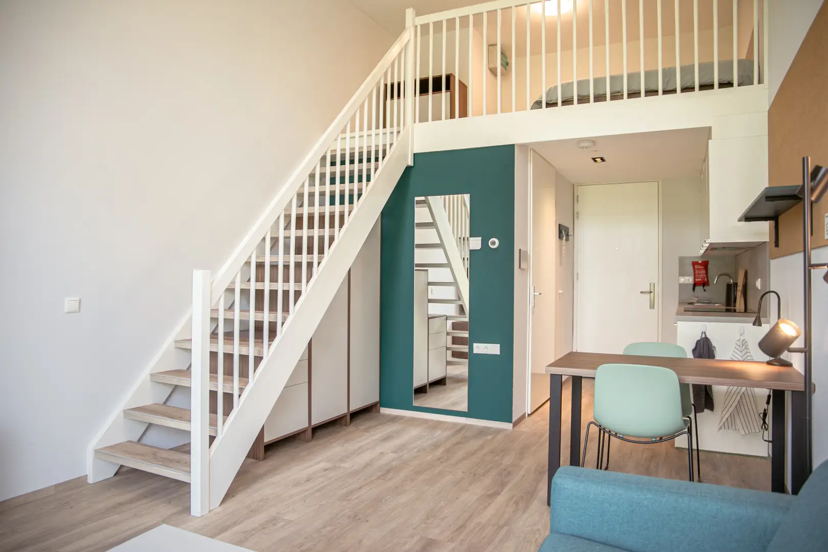 The Loft in building D is part of the campus of the NHL Stenden Hogeschool in Leeuwarden and located on the ground floor. The Loft has an extra high ceiling and is in total 4 meters high. This apartment is equipped with a living room and a kitchen on the ground floor. A stair leads to a second mezzanine floor. This floor is equipped with a European queen sized bed and measures 160cm wide and 200cm long. The mezzanine floor is 150 centimeter high and adds a lot of extra space to this room. Beneath the stairs is a build-in closet where you can store your clothes and suitcase.