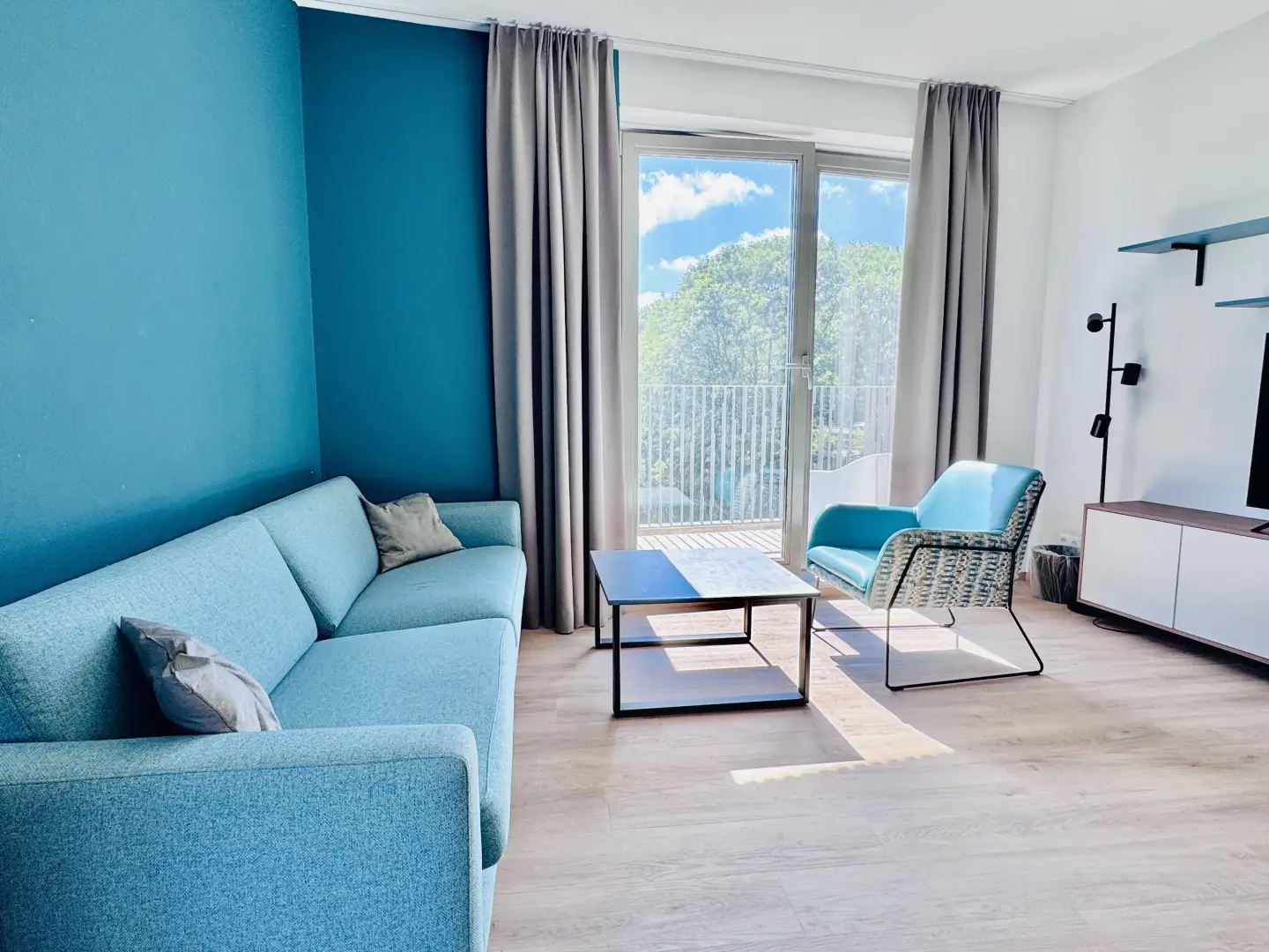 The furnishings in the residences are unique and designed to maximize storage space. A professional designer curated the interiors, incorporating a stylish color palette of light blue (turquise), ocean blue and dark green to create a cozy and functional atmosphere.