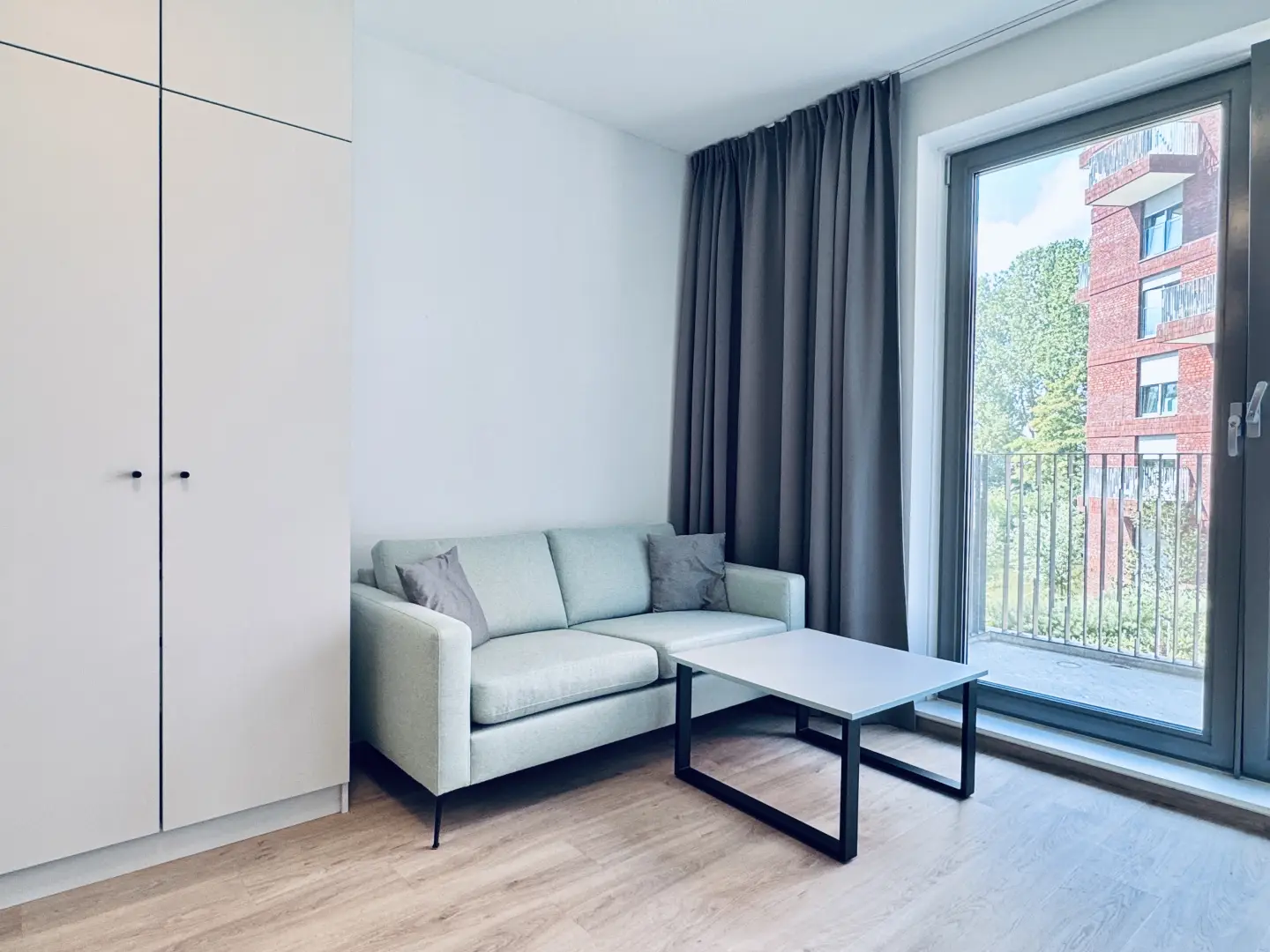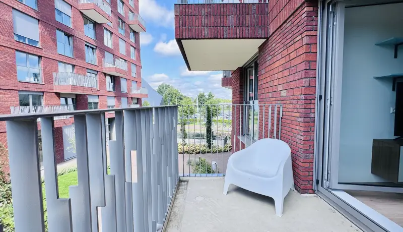 The kitchen is fully equipped with an oven/microwave-combination, stove, sink, refrigerator and a dishwasher. You won’t have to worry about cleaning dirty dishes yourself. Pots, pans and cutlery are not included. This specific Studio has nice, large, inward opening windows with a private balcony