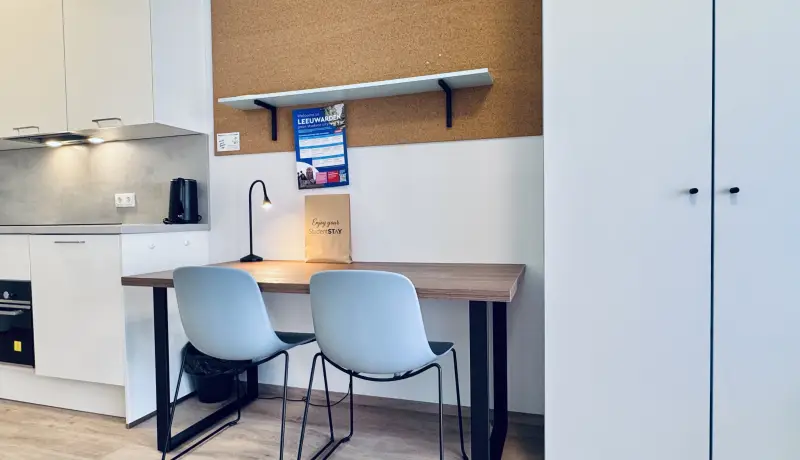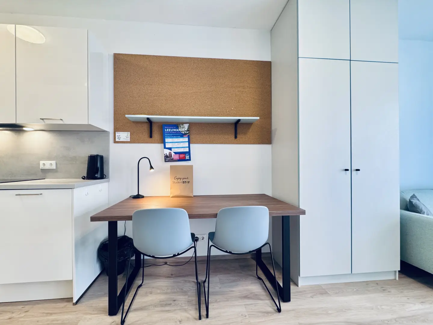 This beautiful Studio in building D is part of the campus of the NHL Stenden Hogeschool in Leeuwarden. You will find a fully furnished open kitchen, a living- and sleeping area. The Studio is equipped with a European double bed and measures 140cm wide and 200cm long. Underneath the bed you will find drawers for extra storage space. The living area of the Studio is equipped with a dining table, a large wardrobe, a 55-inch TV and a cozy couch with coffee table.