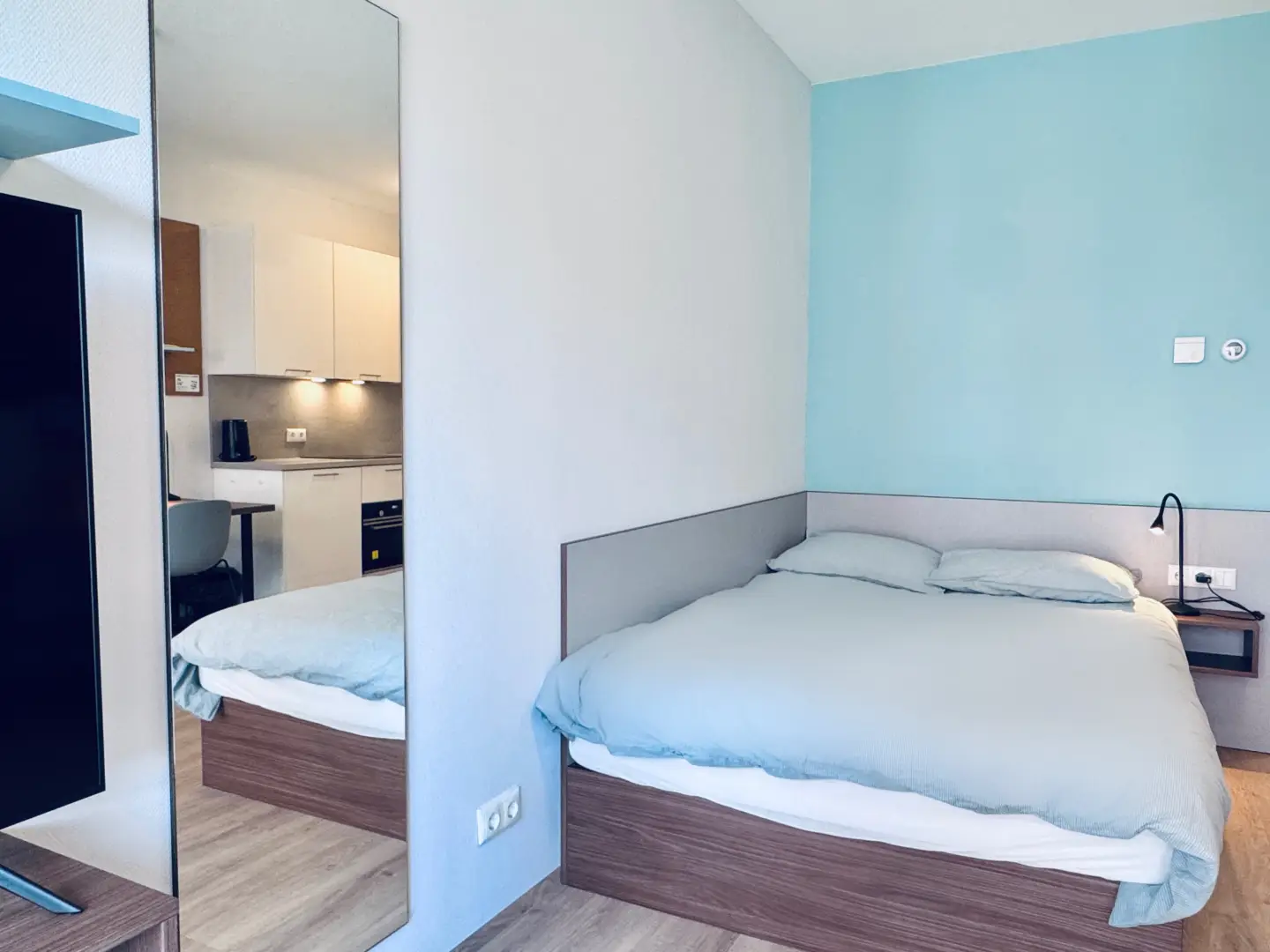 The kitchen is fully equipped with an oven/microwave-combination, stove, sink, refrigerator and a dishwasher. You won’t have to worry about cleaning dirty dishes yourself. Pots, pans and cutlery are not included. This specific Studio has nice, large, inward opening windows with a private balcony