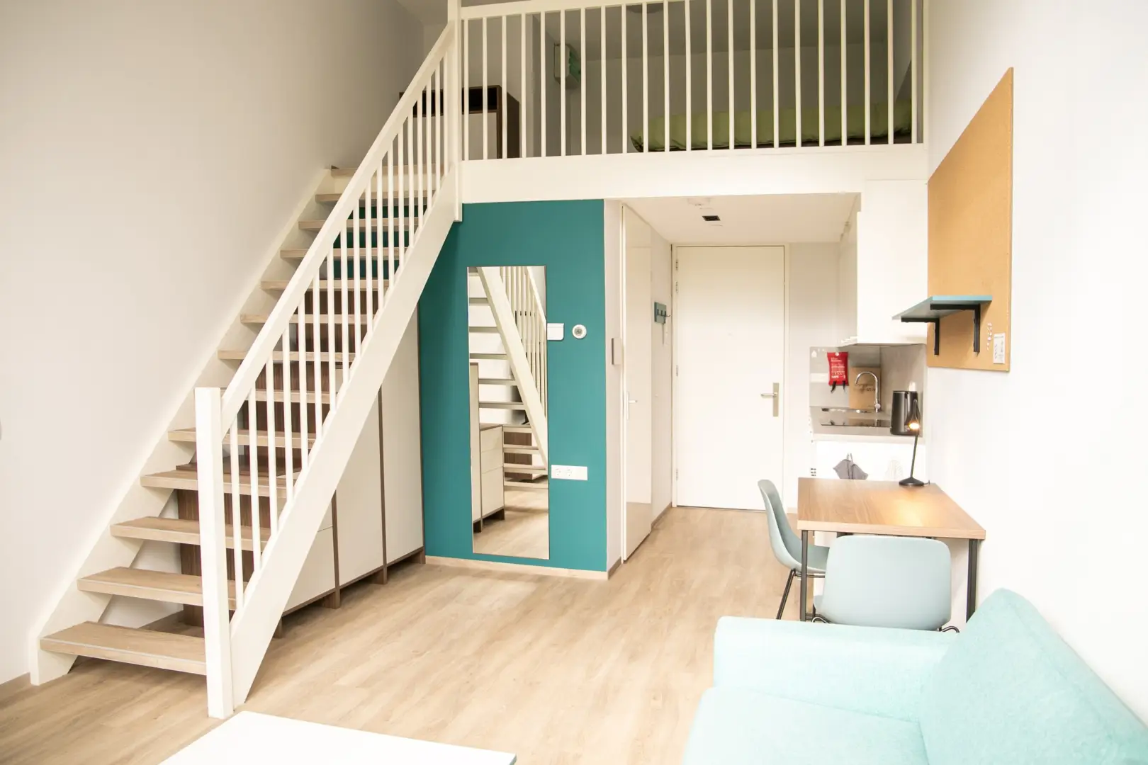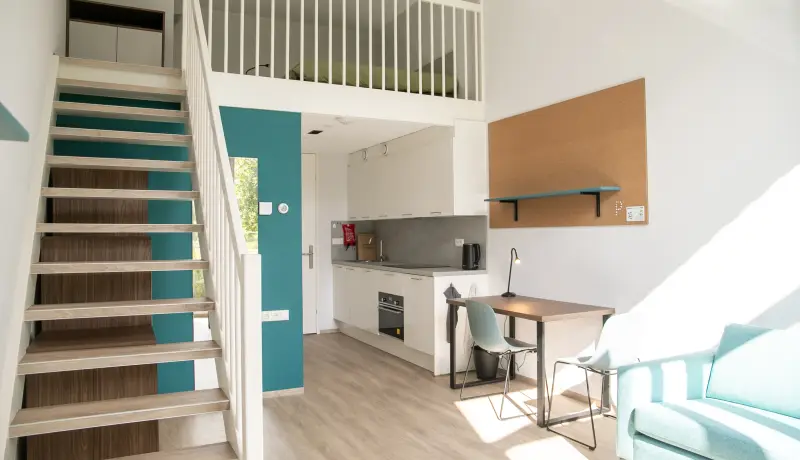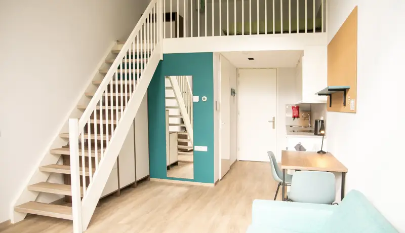 The Loft in building D is part of the campus of the NHL Stenden Hogeschool in Leeuwarden and located on the ground floor. The Loft has an extra high ceiling and is in total 4 meters high. This apartment is equipped with a living room and a kitchen on the ground floor. A stair leads to a second mezzanine floor. This floor is equipped with a European queen sized bed and measures 160cm wide and 200cm long. The mezzanine floor is 150 centimeter high and adds a lot of extra space to this room. Beneath the stairs is a build-in closet where you can store your clothes and suitcase.