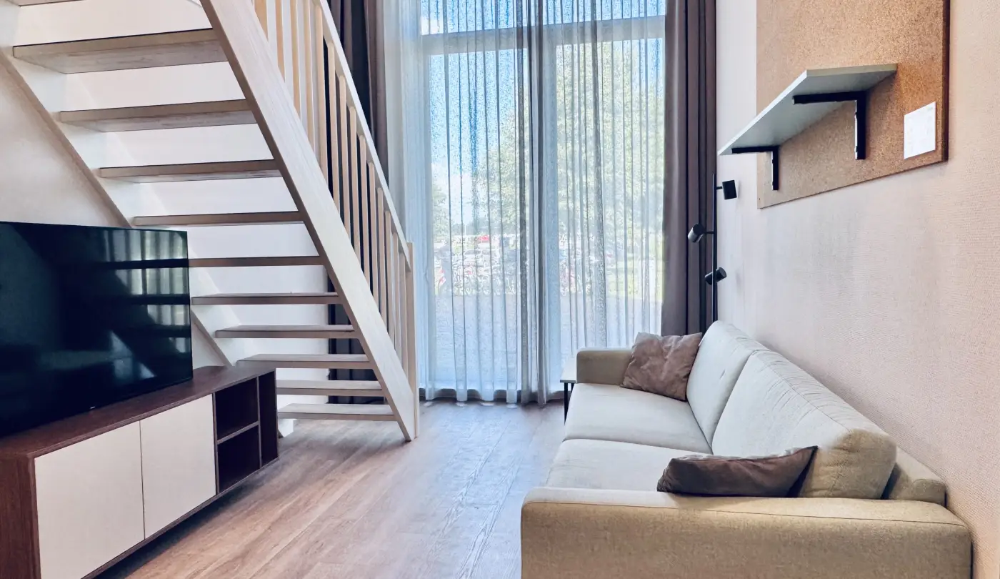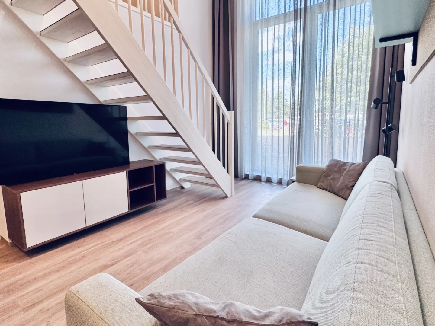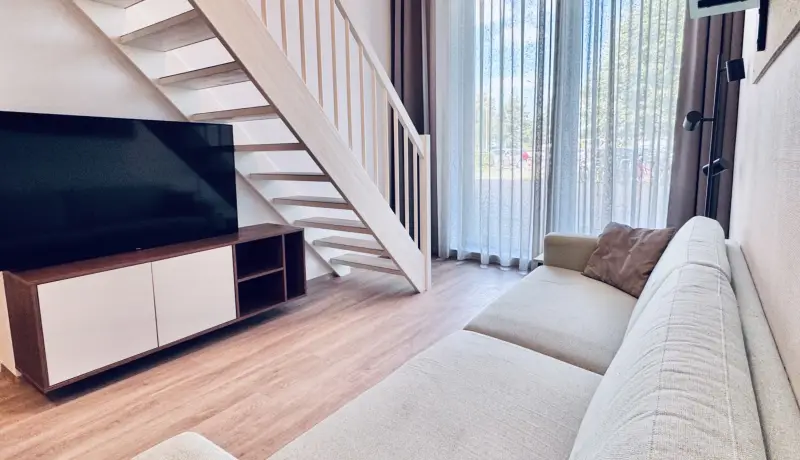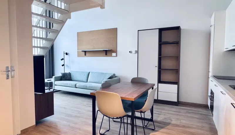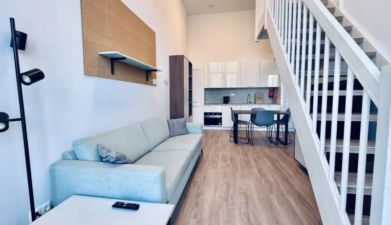 The living area of the Loft is equipped with a big dining table, a cozy couch with separate lounge chair and coffee table. There is a wardrobe to store your clothes.
