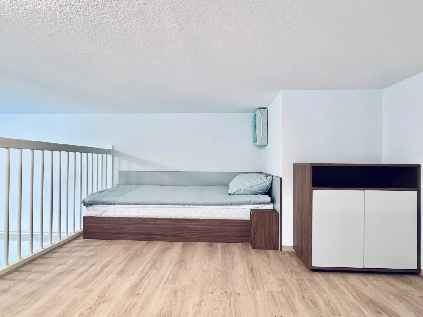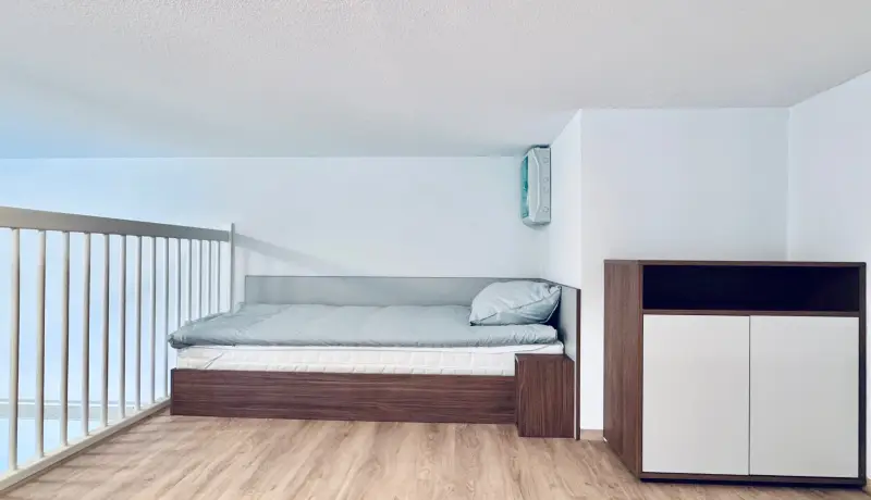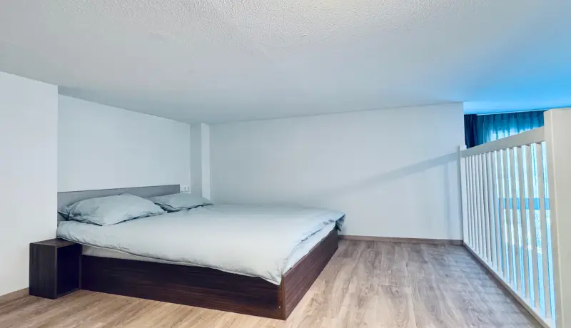 The Loft in building D is part of the campus of the NHL Stenden Hogeschool in Leeuwarden and located on the ground floor. The Superior Loft has an extra high ceiling and is in total 4 meters high. This apartment is equipped with a living room, a kitchen and a separate bedroom. A stair leads to a mezzanine floor with one extra bed. The bedroom on the ground floor is furnished with a European king size bed which measures 160cm wide and 200 long. On the second mezzanine floor you will find another European king size bed (160cm x 200cm) as well as a one person’s 90cm wide and 200cm long bed, which is perfect for sharing, or for sleepovers. The mezzanine floor is 150cm high. Please take a look at the floorplan of the ground floor mezzanine for sizes and the overview. In total this apartment gives room to three beds.
