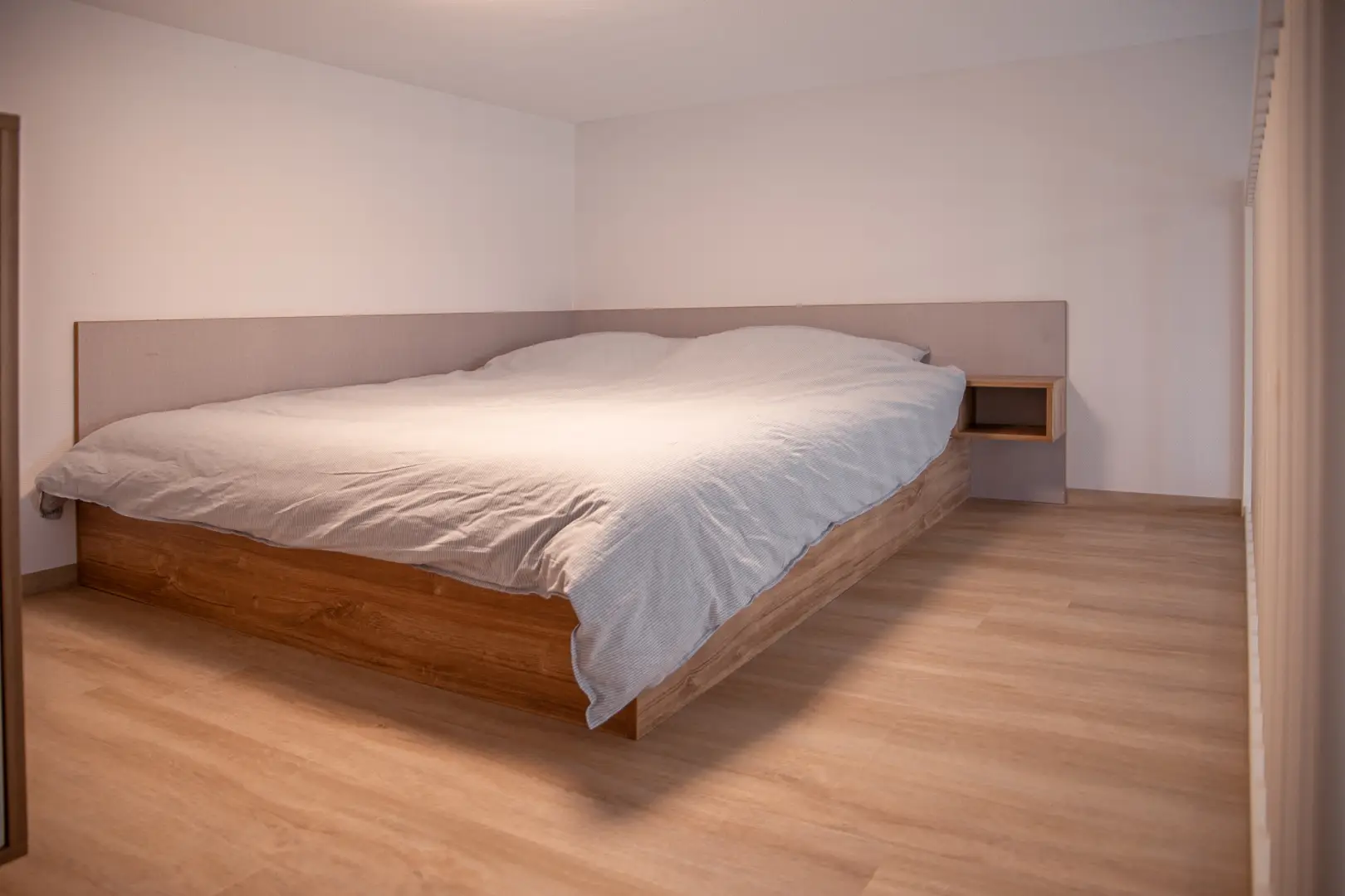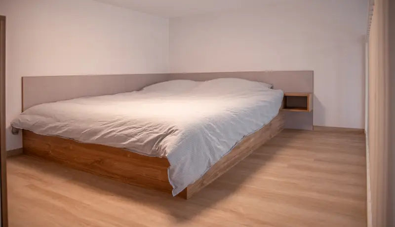The mezzanine is equipped with a European king-size bed (160 cm x 200 cm) and has a ceiling height of 150 cm, making it a cozy yet spacious area. Beneath the stairs, you’ll find a built-in closet perfect for storing clothes and luggage.