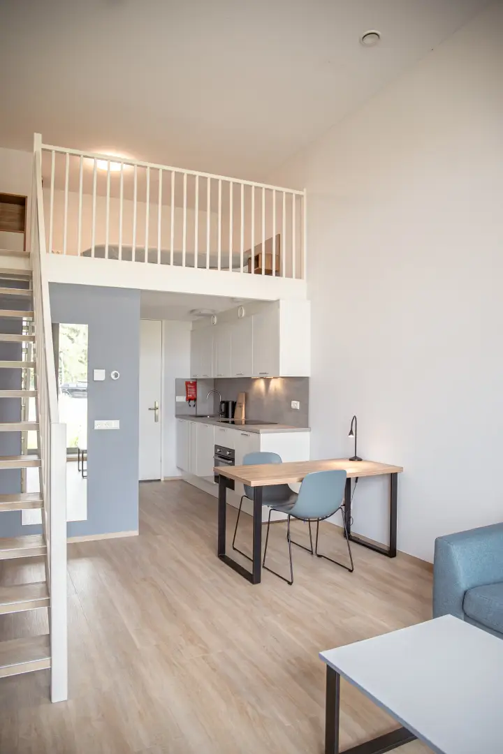 This spacious loft, located on the ground floor of Building E on the NHL Stenden Hogeschool campus in Leeuwarden, offers a modern and open living space with a striking 4-meter-high ceiling. The loft includes a living room and kitchen on the ground floor, with a staircase leading to a mezzanine level that adds extra space and functionality to the apartment.
