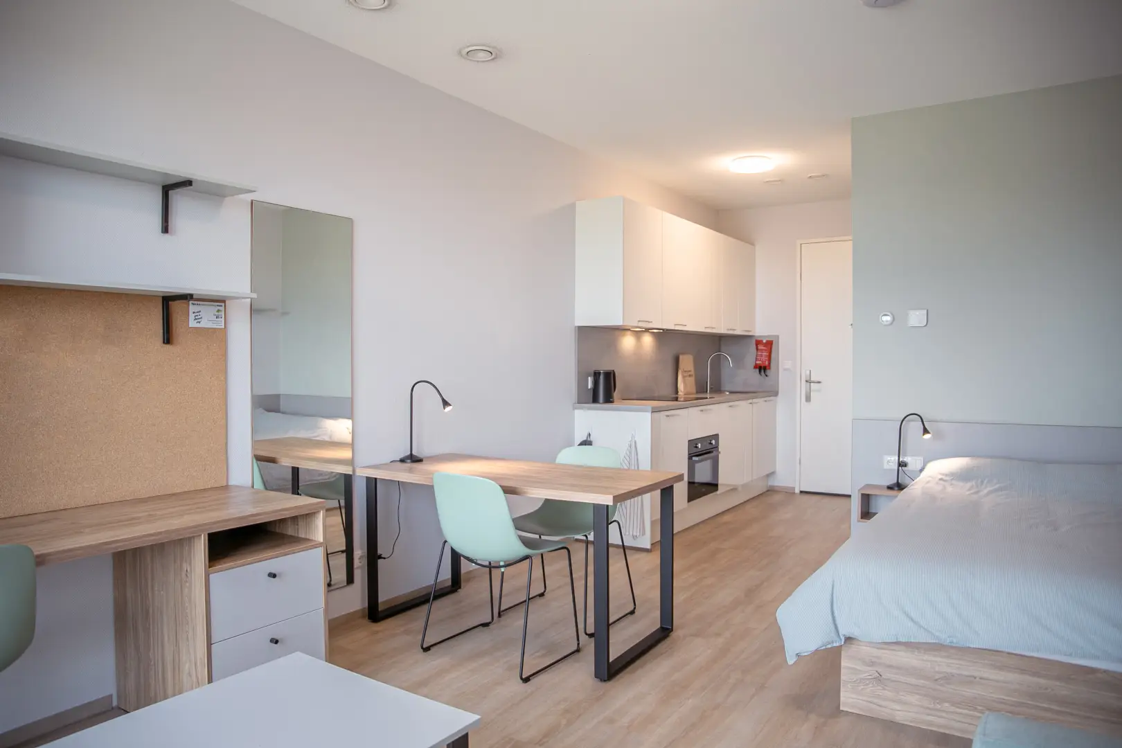 This beautiful Studio in building E is part of the campus of the NHL Stenden Hogeschool in Leeuwarden. You will find a fully furnished open kitchen, a living- and sleeping area. The Studio is equipped with a European double bed and measures 140cm wide and 200cm long. Underneath the bed you will find drawers for extra storage space. The living area of the Studio is equipped with a dining table, a large wardrobe, and a cozy couch with coffee table. The studio also contains a separate study desk with a comfortable office chair so that you can concentrate on your studies.