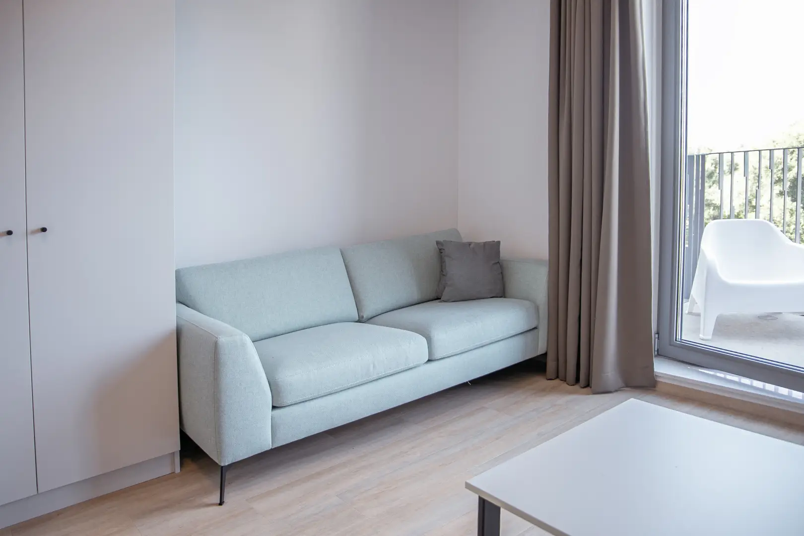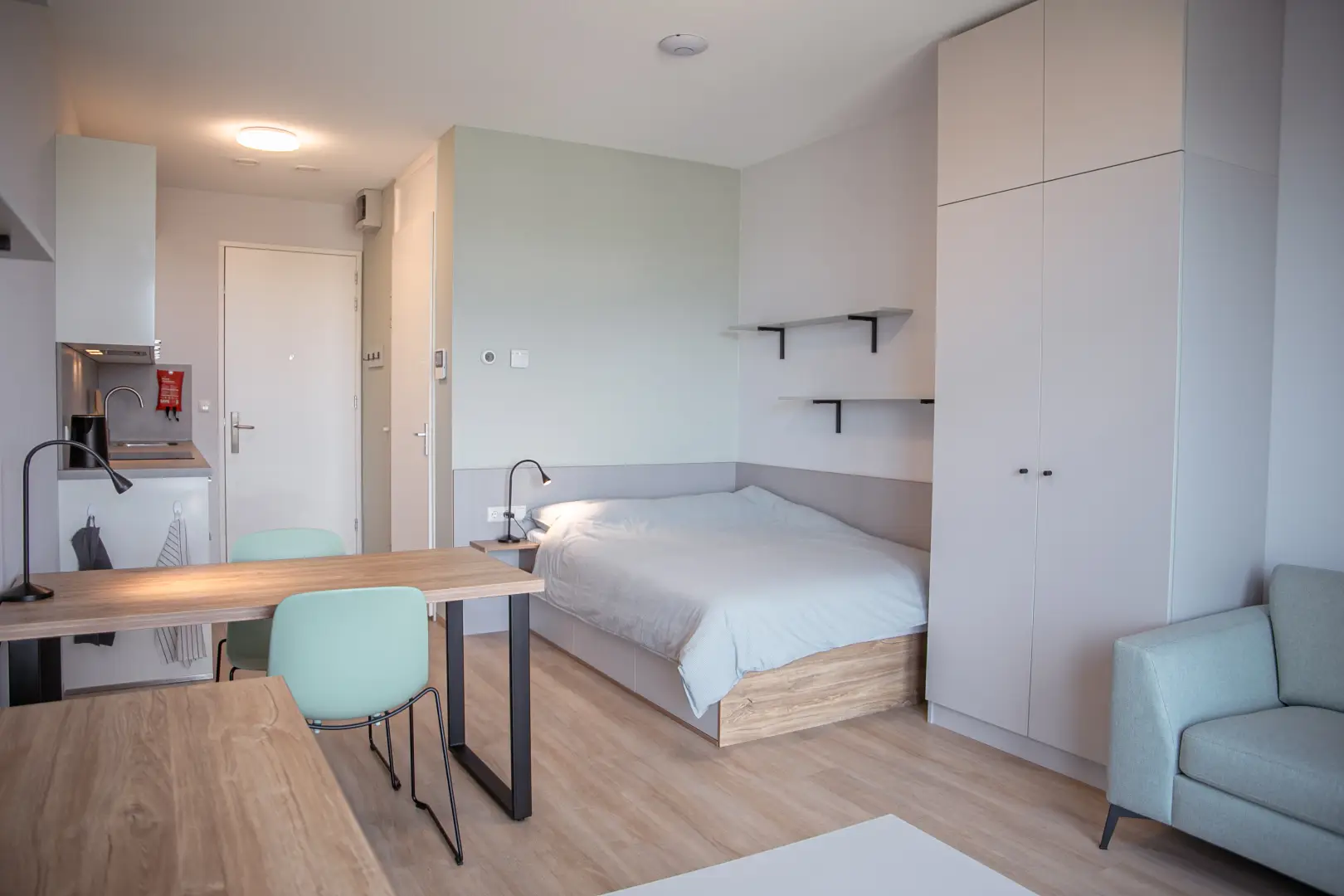 The kitchen is fully equipped with an oven/microwave-combination, stove, sink, refrigerator and a dishwasher. You won’t have to worry about cleaning dirty dishes yourself. Pots, pans and cutlery are not included. This specific Studio has nice, large, inward opening windows with a private balcony! This studio has pistachio-green color elements on the wall and furniture. Please see the impression photos to get an impression of how the actual studio will look like.