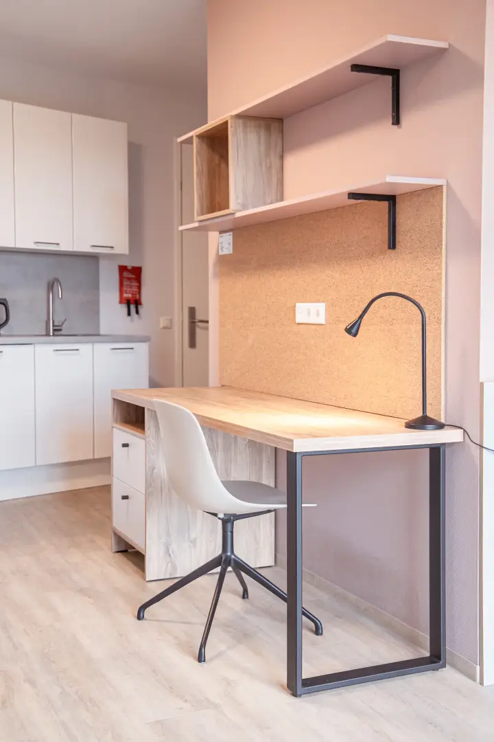 This beautiful Studio in building E is part of the campus of the NHL Stenden Hogeschool in Leeuwarden. You will find a fully furnished open kitchen, a living- and sleeping area. The Studio is equipped with a European double bed and measures 140cm wide and 200cm long. Underneath the bed you will find drawers for extra storage space. The living area of the Studio is equipped with a dining table, a large wardrobe, and a cozy couch with coffee table. The studio also contains a separate study desk with a comfortable office chair so that you can concentrate on your studies.