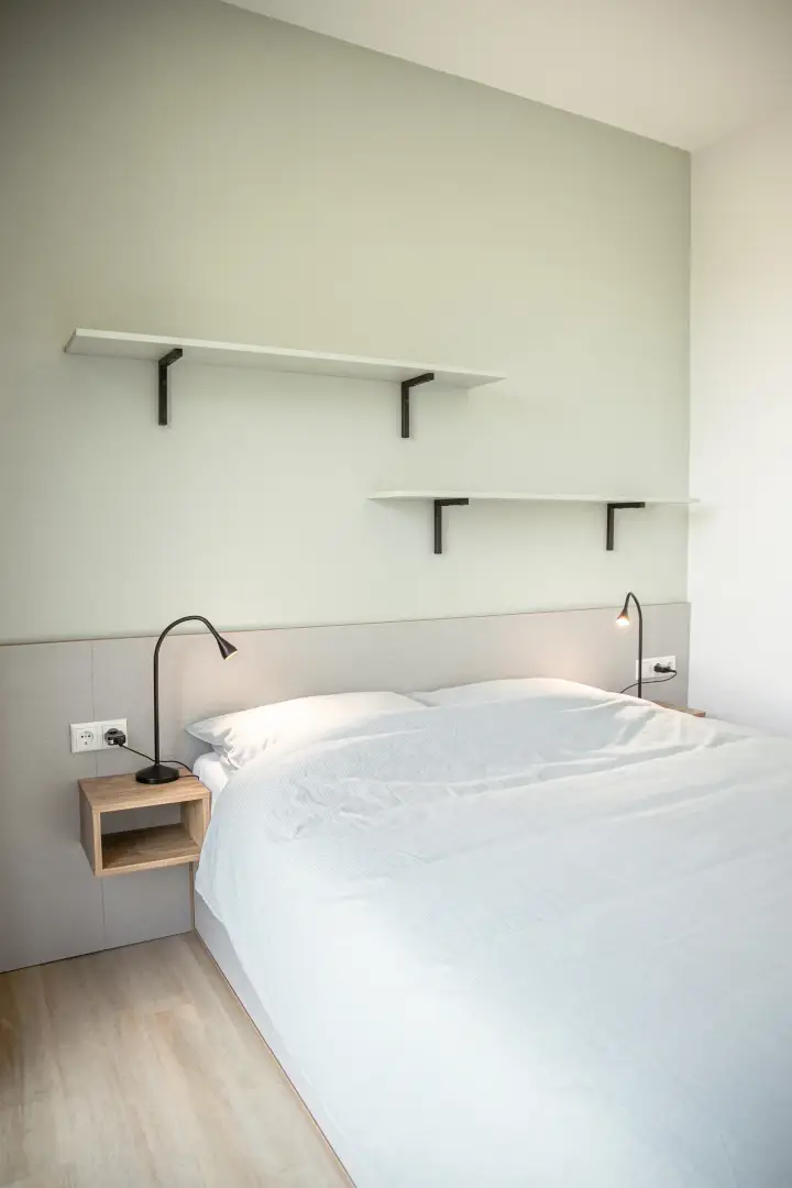 This stunning suite, located in Building E on the campus of NHL Stenden Hogeschool in Leeuwarden, offers a comfortable and fully furnished living space. The suite features an open-plan kitchen, a cozy living room, and a separate bedroom. The bedroom is equipped with a European king-size bed (160 cm wide by 200 cm long), complete with storage drawers underneath for extra space.
