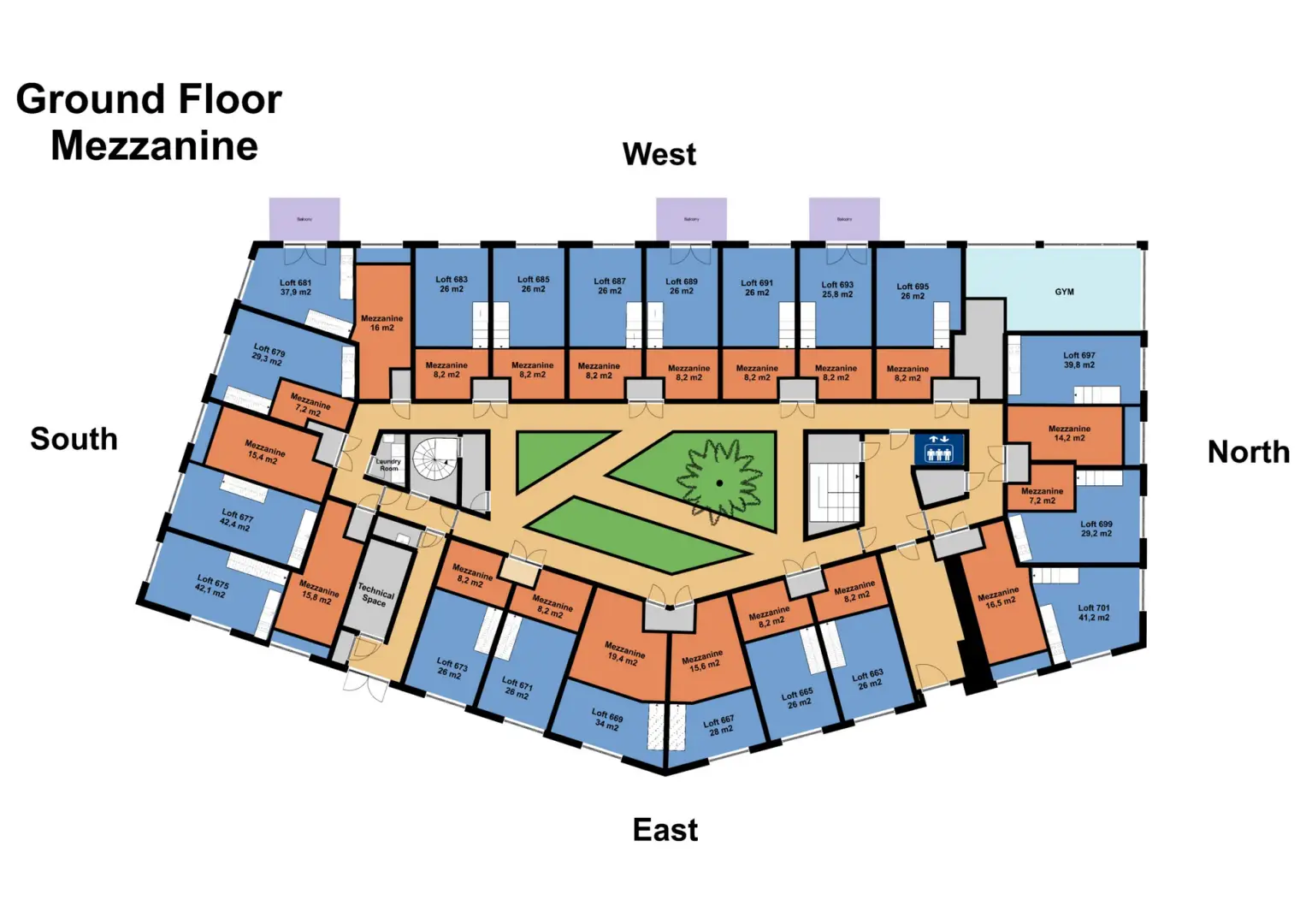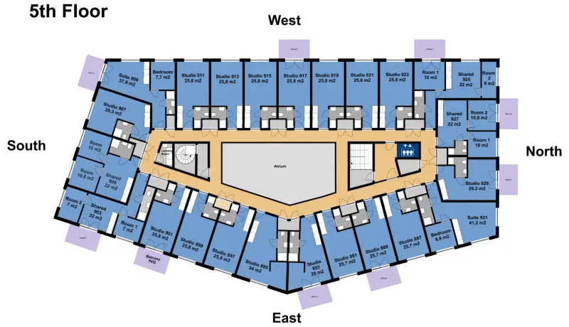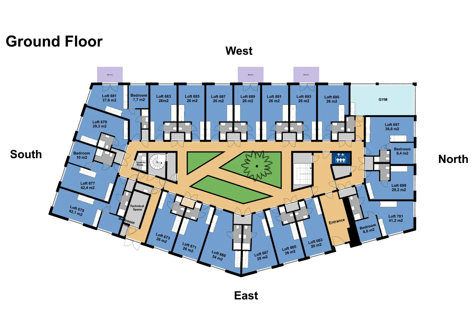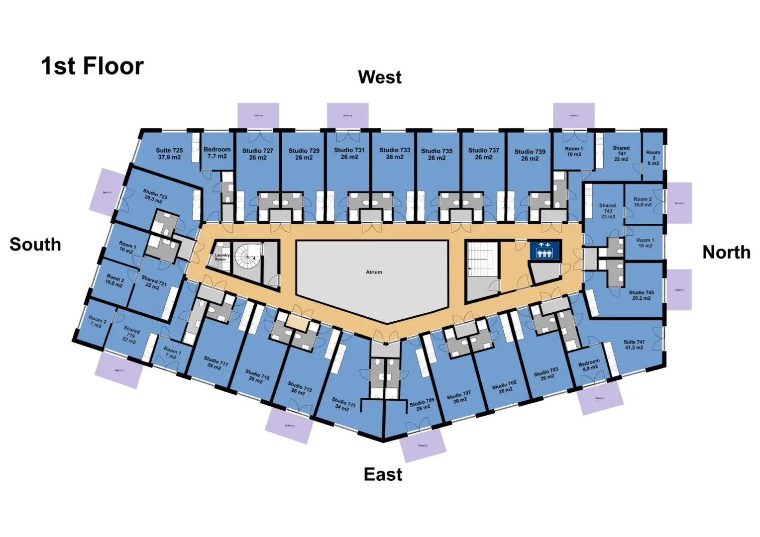 - A laundry room on each floor, with washing machines, dryers, and ironing stations