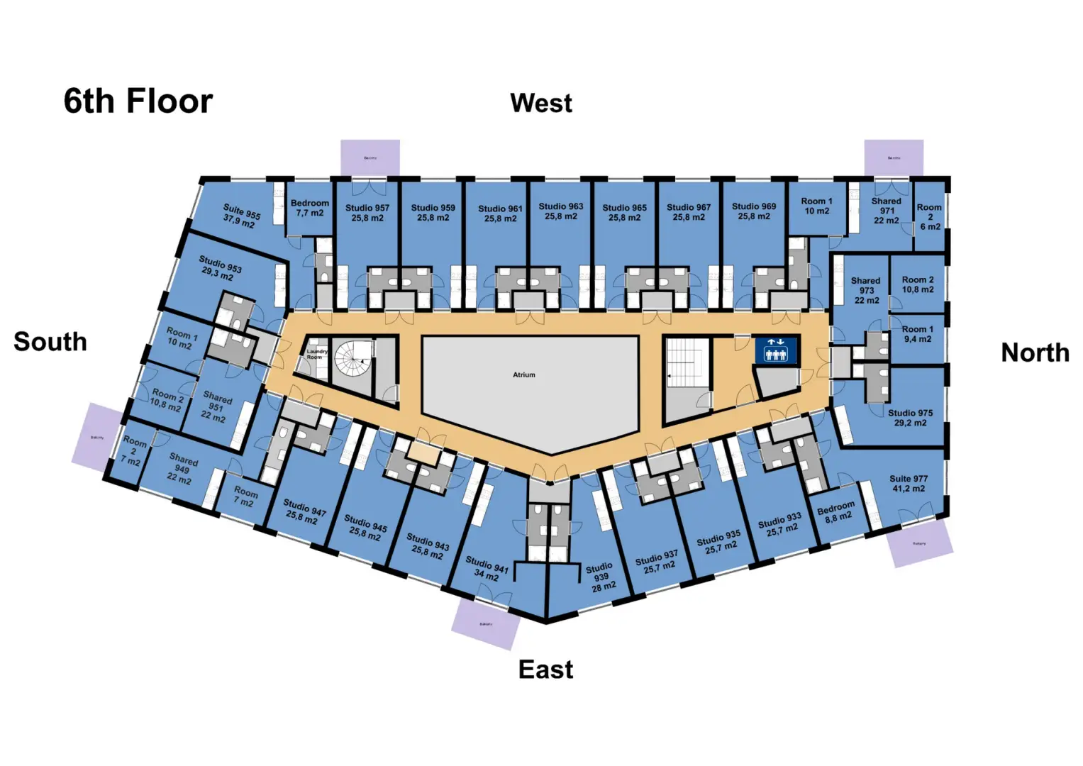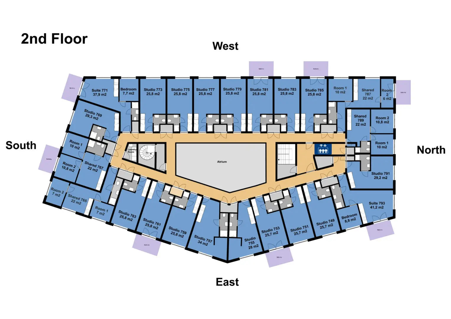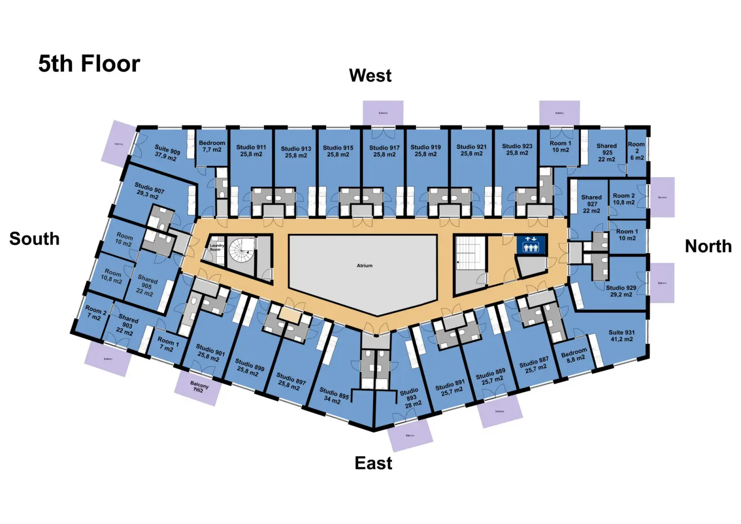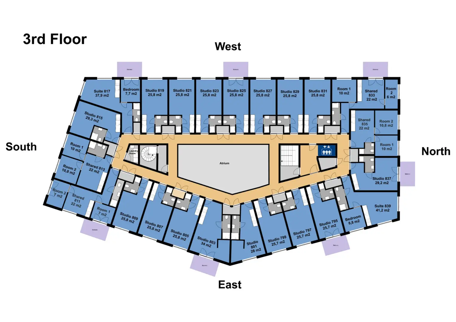 Building E features 181 brand-new studios and apartments, spread across 8 floors. The south-facing side of the building overlooks the scenic Rengerspark. Construction was completed in August 2023, offering modern, high-quality living spaces for students.