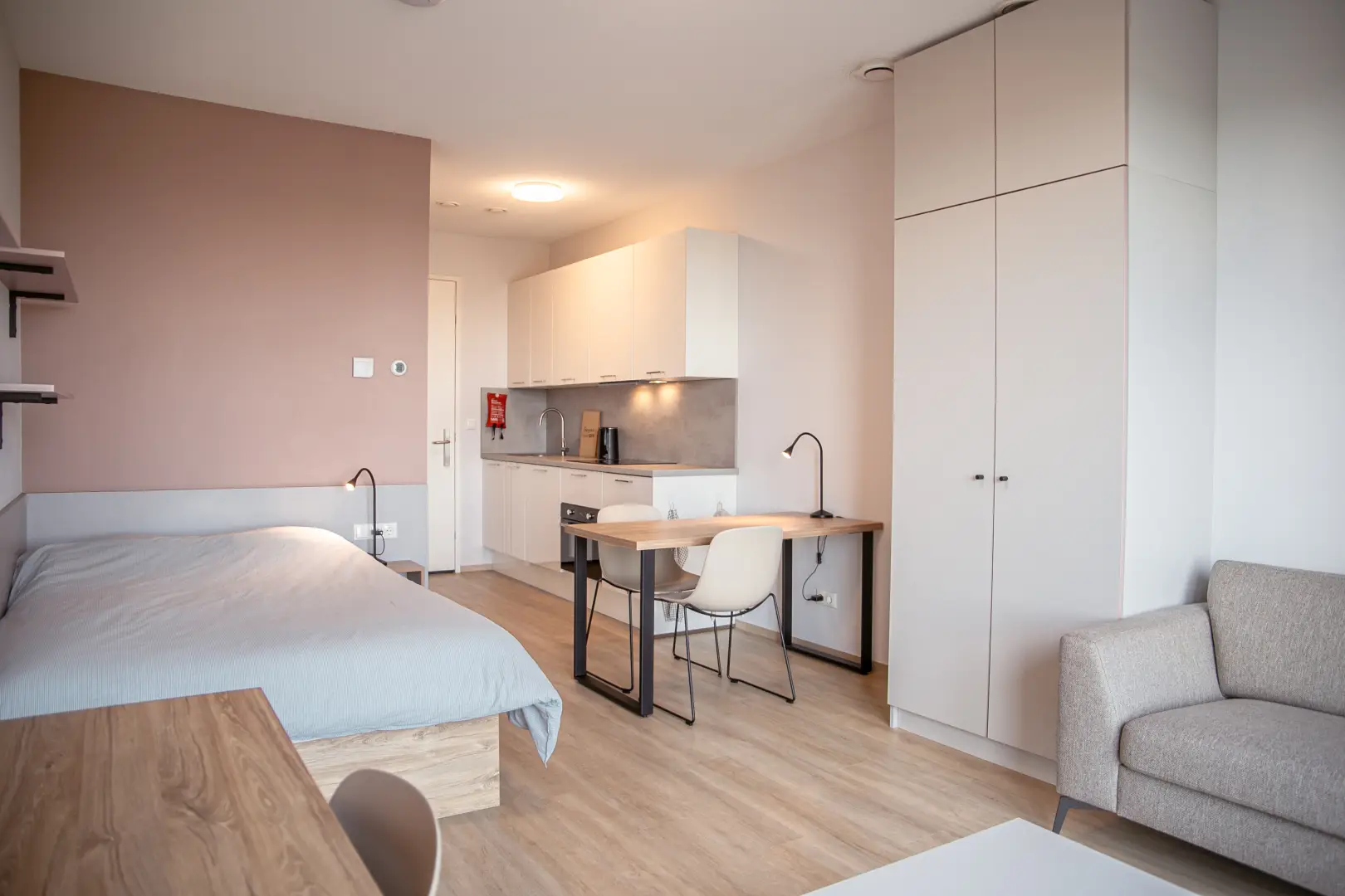 The kitchen is fully equipped with an oven/microwave-combination, stove, sink, refrigerator and a dishwasher. You won’t have to worry about cleaning dirty dishes yourself. Pots, pans and cutlery are not included. This specific Studio has nice, large, inward opening windows with a French balcony This studio has antique-rose color elements on the wall and furniture. Please see the impression photos to get an impression of how the actual studio will look like.